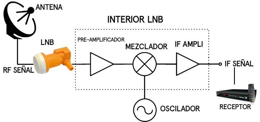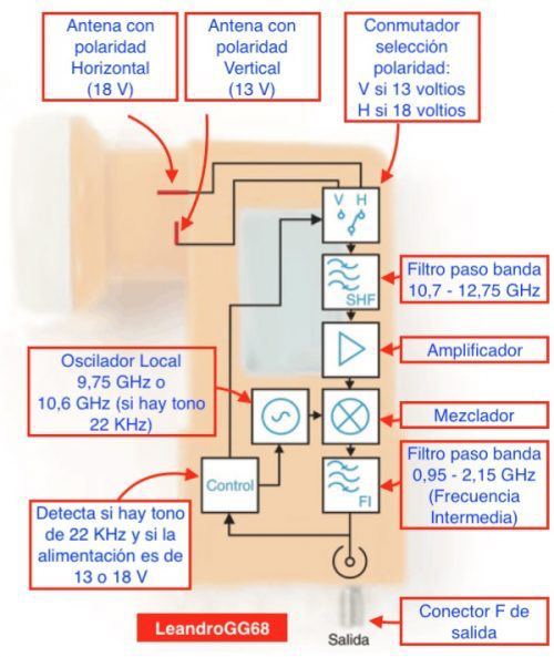 Para seleccionar una u otra antena, se usa el voltaje que proporciona el receptor. Y luego se usa un oscilador de 9750 mhz para las frecuencias de 10,7 a 11,7 GHz y otro de 10600 mhz para las frecuencas de 11,7 a 12,75 GHz, para seleccionarlo se usa un tono de 22 Khz.