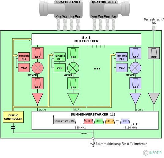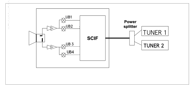 En el caso que otro tuner del receptor solicitara otra posicion, entonces el lnb unicable enviaria otra frecuencia a traves de otro UB distinto, por lo que en este caso de este sistema no tendriamos limite de polaridad y banda como ocurria con los lnb universales.