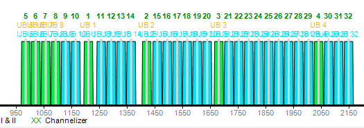 Como vimos en las explicaciones anteriores, un lnb universal transmitía toda la banda de frecuencias intermedias (compuesta o por frecuencias banda alta V|H o por frecuencias banda Baja V|H, pues la principal caracteristica del Sistema Unicable Jess No transmite toda la banda de frecuencia intermedia sino que esta la divide en frecuencias específicas, lo que se denomina banda de usuario (UB), es decir divide el rango intermedio de frecuencias que como vimos era 950 a 2.150 MHZ en (UB), siendo el ancho de banda por defecto de cada UB de 30 mhz,