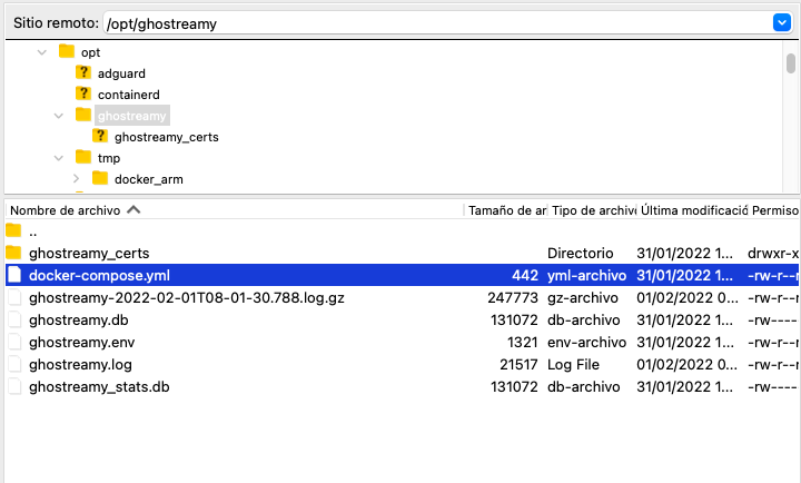 Los parametros de configuracion de ghostreamy asi como demas archivos creados por ghostreamy los podemos encontrar en el directorio parche que pusimos en el docker-compose, en este ejemplo /opt/ghostreamy, siendo el archivo de configuracion el llamado ghostreamy.env