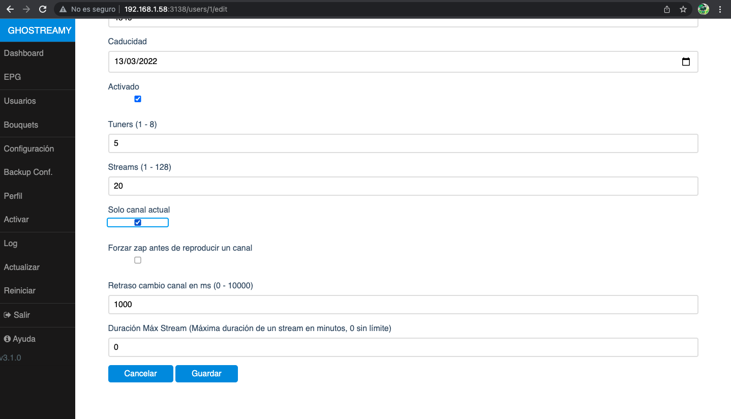 - Añadida la opción de «solo canal actual» por usuario, para indicar que solo se permite a este usuario reproducir el canal sintonizado en el deco.