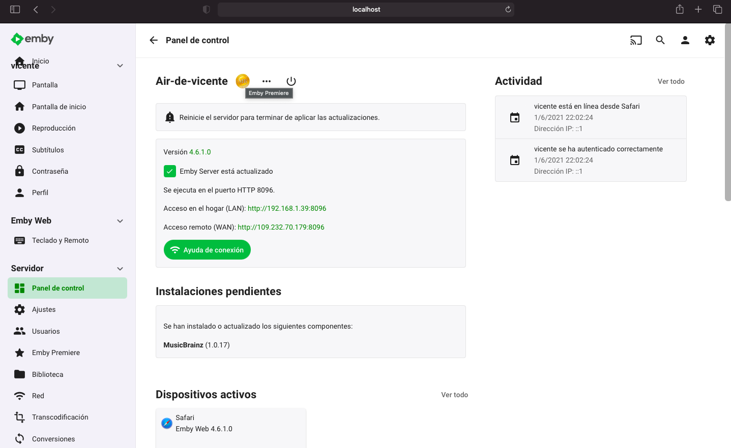 1. Accedemos a nuestro servidor Emby y pulsamos sobre el icono configuracion de la parte superior derecha