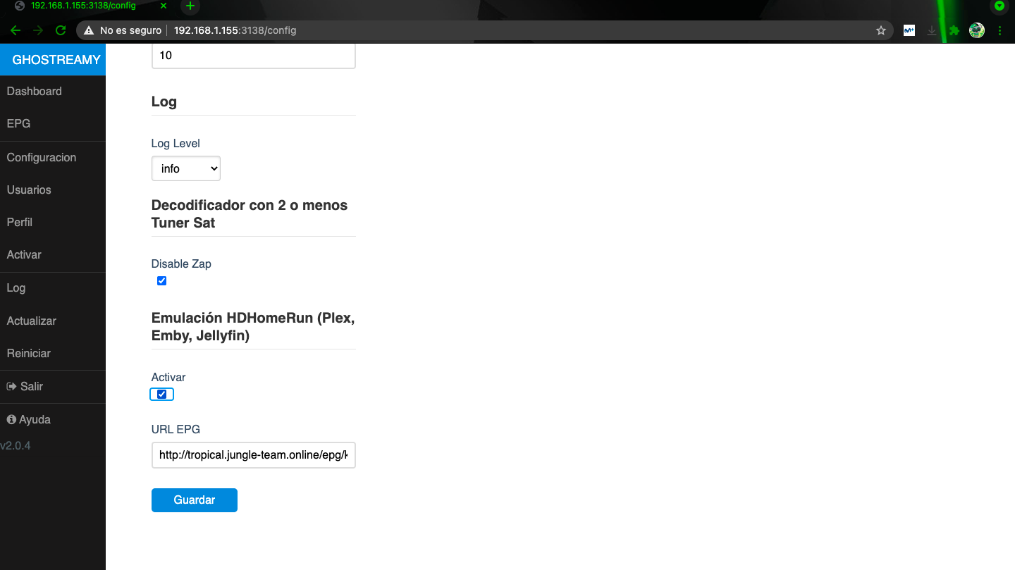 7. Introducimos la url del epg que nos proporciona ghostreamy y pulsamos en guardar