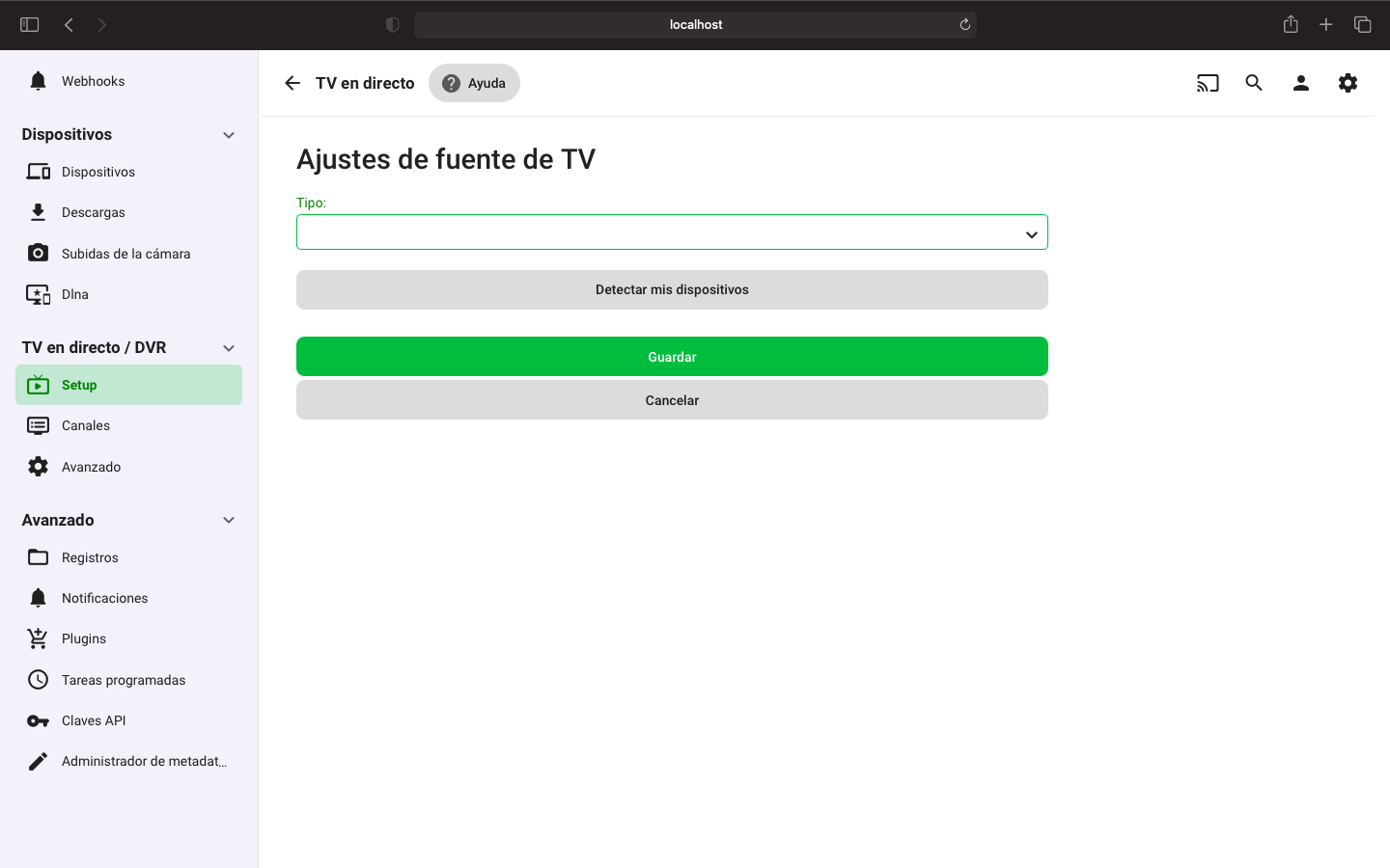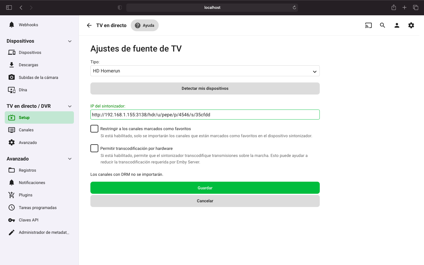 4. Ahora en tipo seleccionamos HDhomeRun e introducimos la url que copiemos en ghostreamy para nuestros canales
