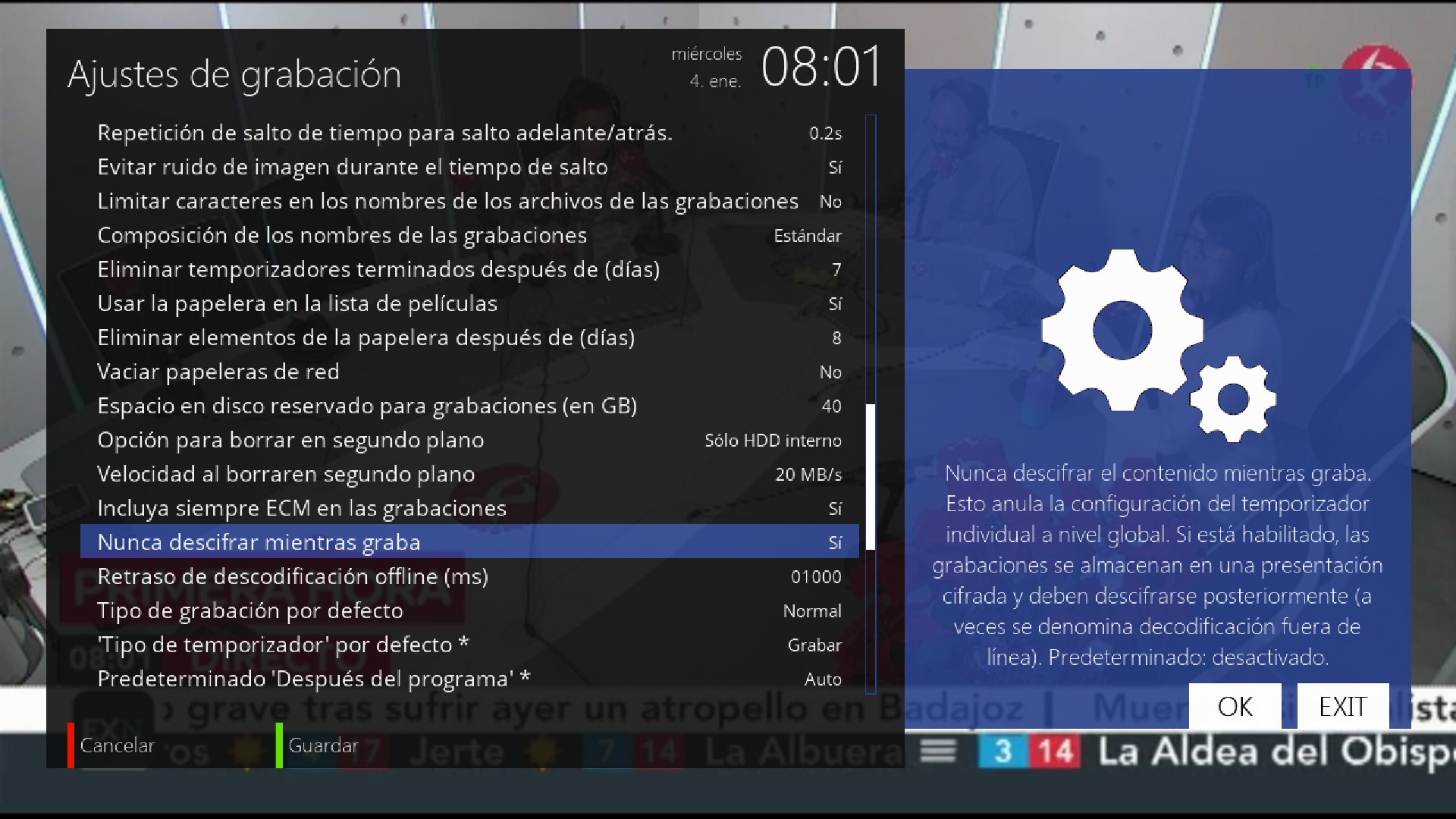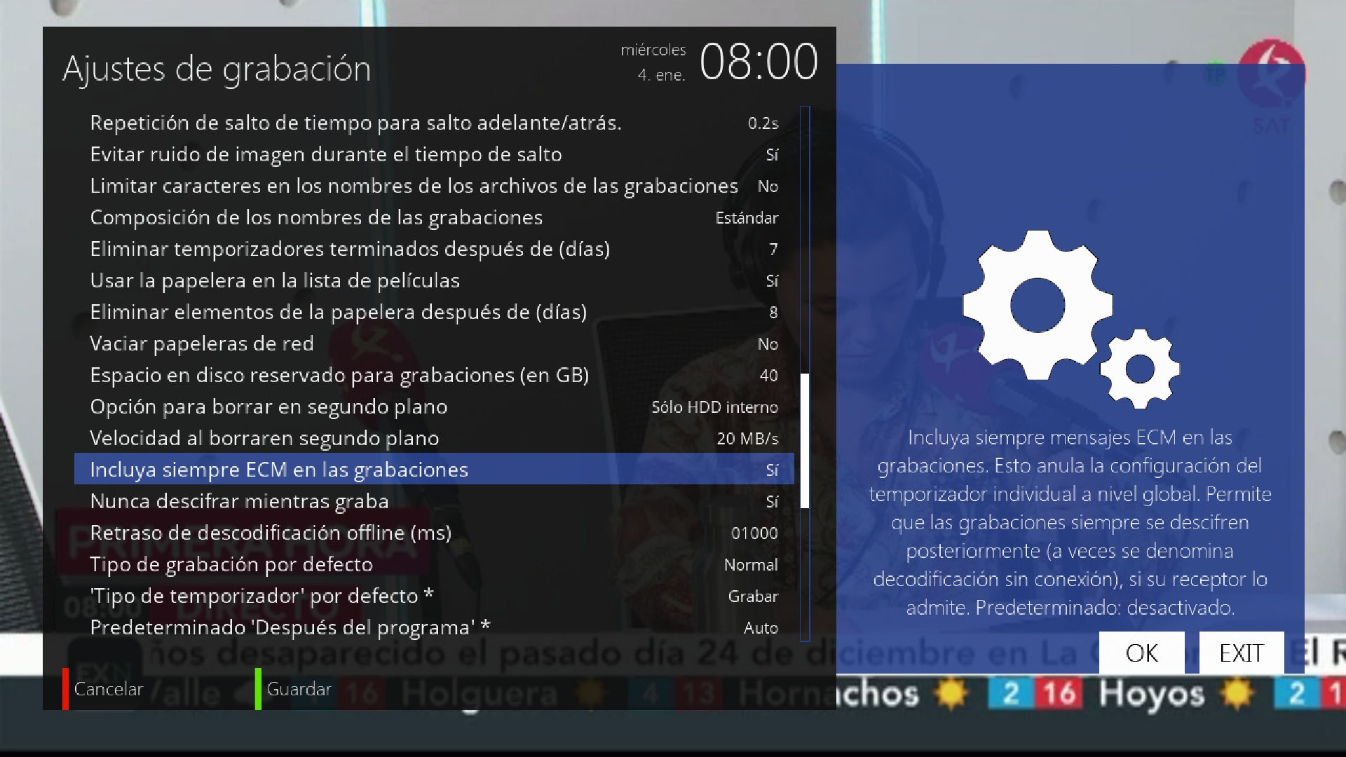 Una vez activas estas dos opciones al realizar la grabacion de un canal cifrado, se añadiran los mensajes ecm al archivo TS y estos estaran sin cifrar:
