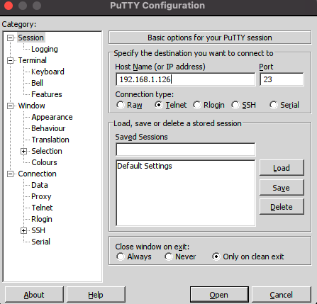 Una vez instalado putty simplemente lo abrimos y a contiuacion: