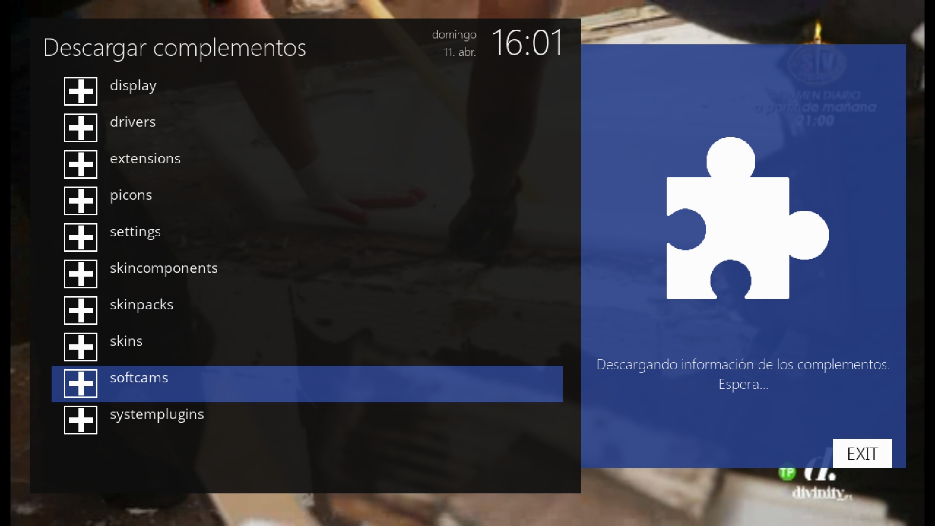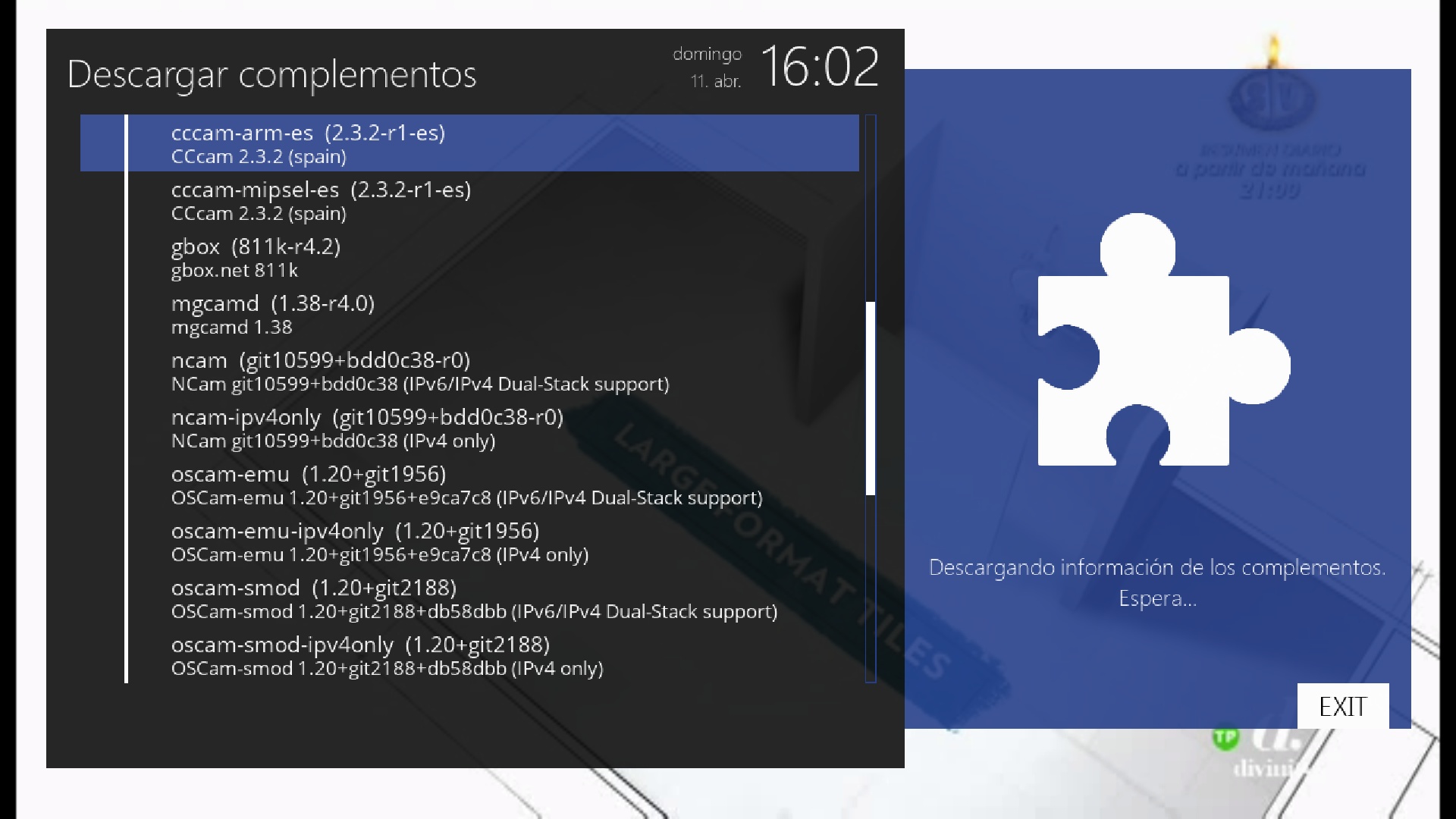 Una vez que hemos realizado la instalacion de repositorios, ahora vamos a ver como realizar la instalacion de la emuladora que deseemos, para ello pulsamos en el receptor en menu + complementos + boton verde + softcam