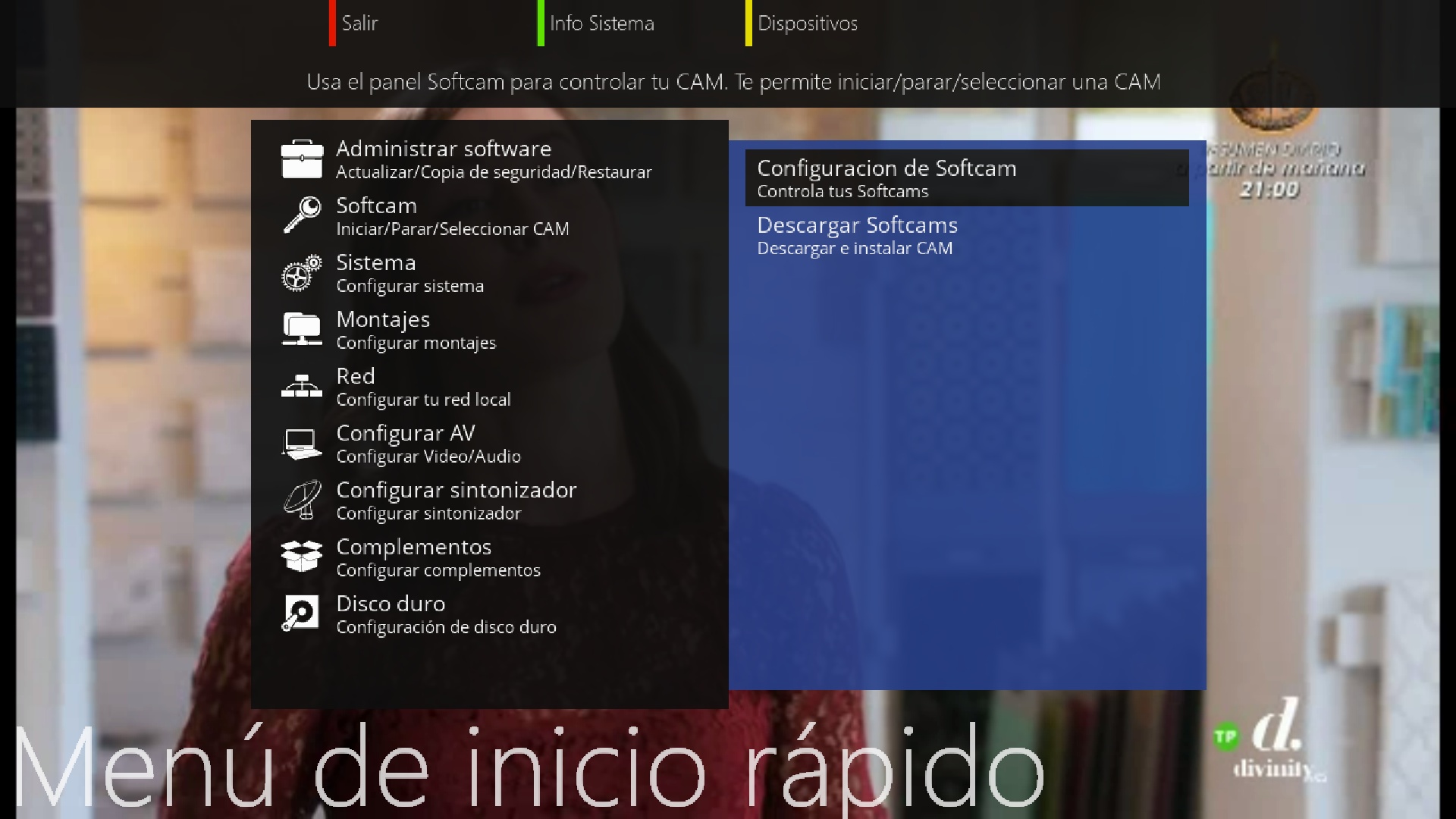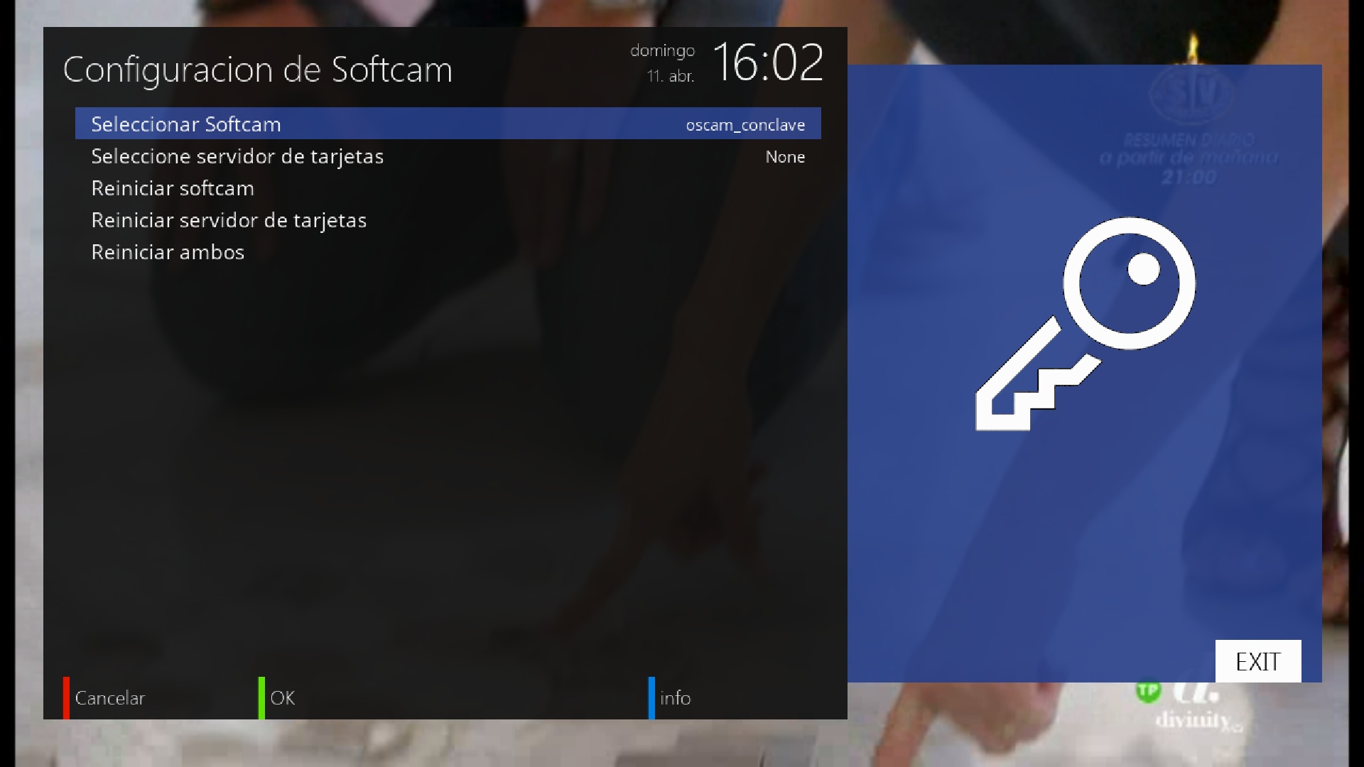 Una vez realizada la instalacion de la emuladora observaremos que ahora nos aparecera una nueva opcion en boton azul + configuracion de softcam (esta opcion no sale si no tenemos instalada al menos una emuladora)