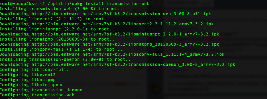 Una vez realizada la instalacion de entware, ahora vamos a instalar transmission, para ello ejecutamos estos dos comandos:
