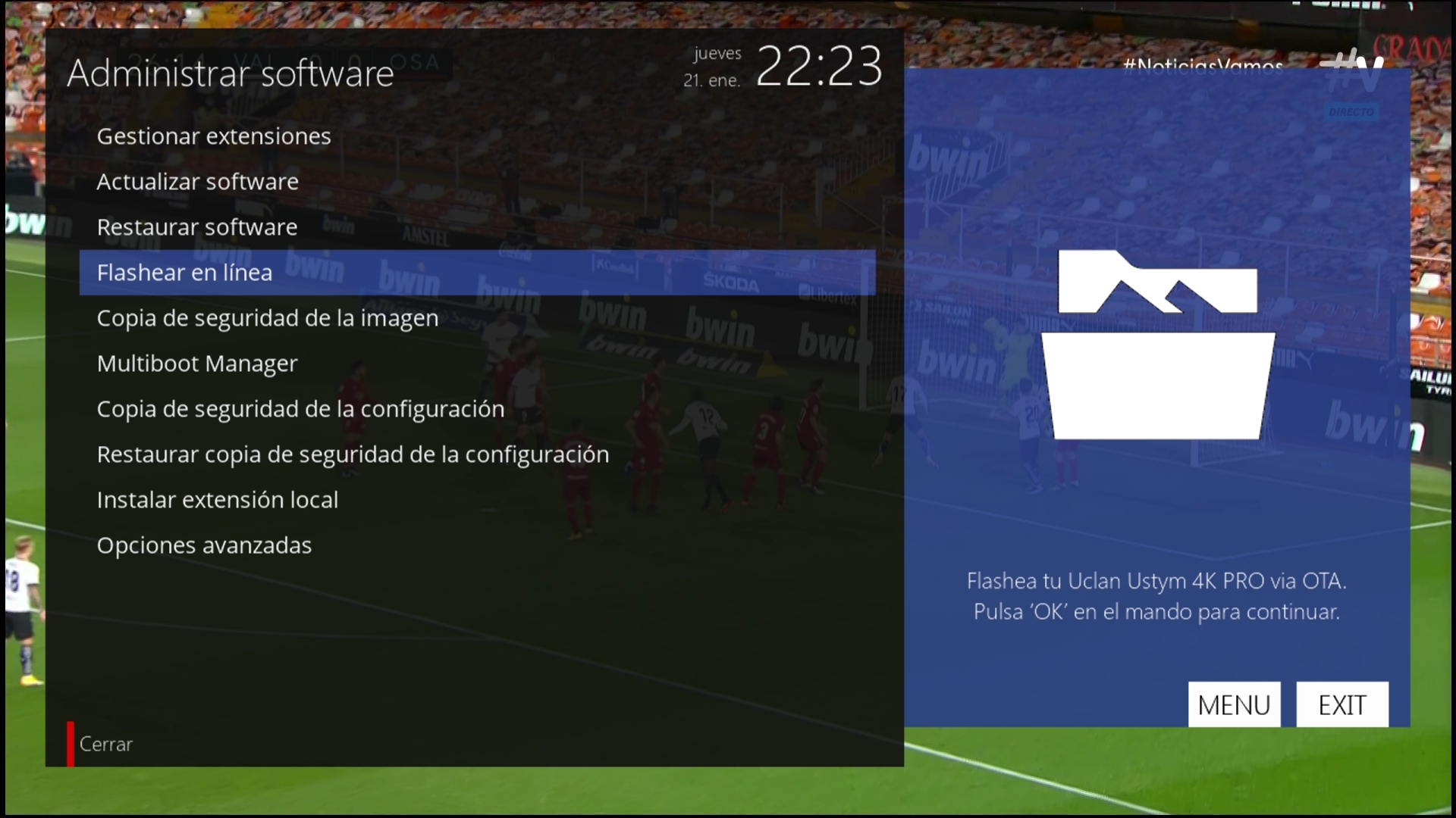 2. Pulsamos en menu + configuracion + Administrador de software + flashear en linea