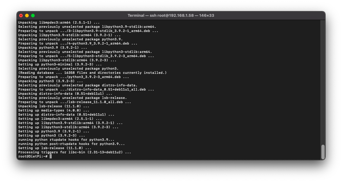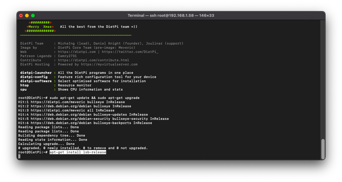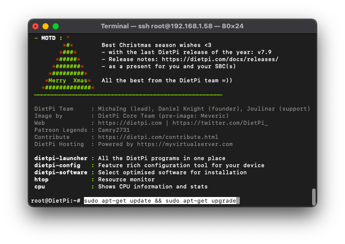 Aunque no es obligatorio, sobre todo en el caso que hallamos instalado recientemente el sistema DietPi, si es recomendable, para ello ejecutaremos el siguiente comando: