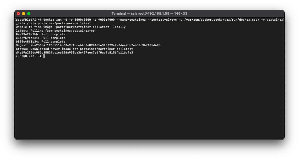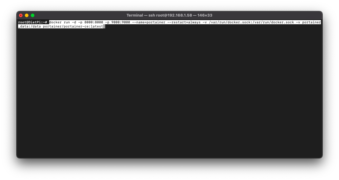 docker run -d -p 8000:8000 -p 9000:9000 --name=portainer --restart=always -v /var/run/docker.sock:/var/run/docker.sock -v portainer_data:/data portainer/portainer-ce:latest