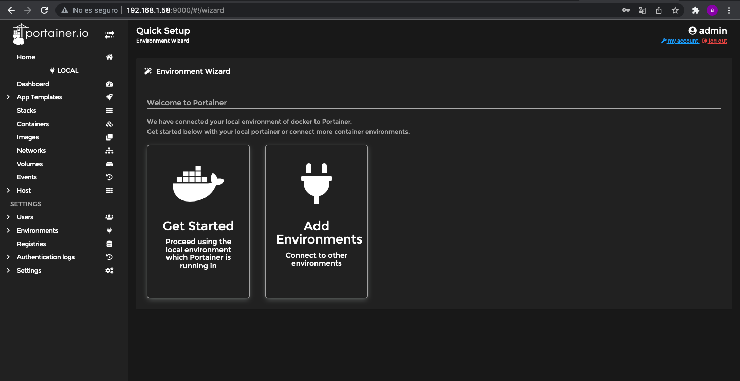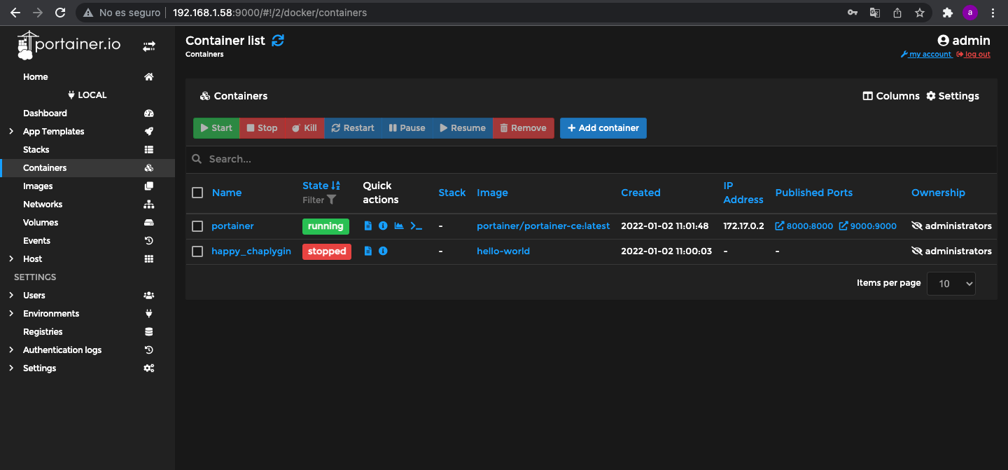 Y de este modo ya podemos acceder en entorno grafico web a la gestion de los contenedores Docker