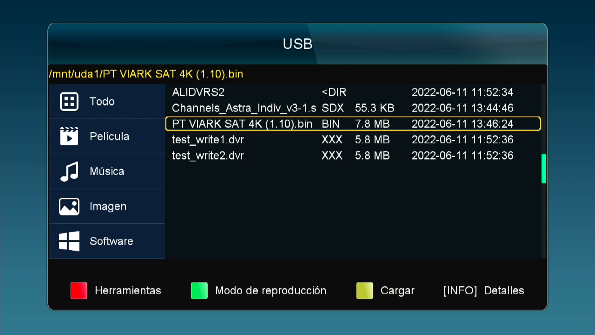 Nos apareceran los archivos que contiene el USB, Seleccionamos el el firmware xxxx.bin que introdujimos en el usb y pulsamos boton amarillo