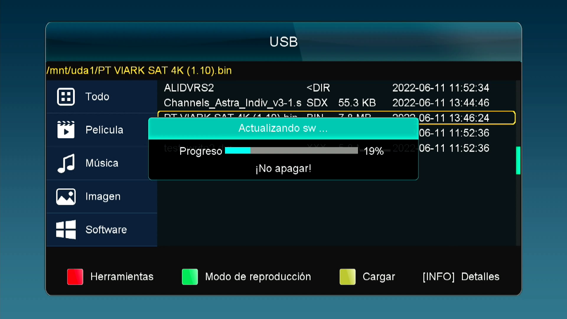 Introducimos el archivo xxx.bin de instalacion en la raiz de un pendrive (el pendrive debe estar formateado en fat32), a continuacion introducimos el pendrive en ranura usb del receptor Viark Sat 4K.
