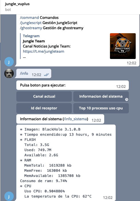 JungleBot es una utilidad creada por jungle-Team para poder controlar nuestros receptores a traves de telegram o recibir informacion del mismo, la imagen enigma2 Blackhole para receptores vuplus por sus caracteristicas no era posible el uso de esta utilidad para quien usa esta imagen.
