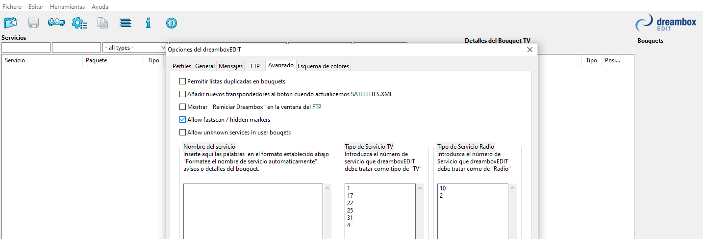 2. Ahora abrimos DreamboxEdit y en opciones vamos a activar el hide marked para conservar los marcadores ocultos, de este mode tendremos la numeracion oficial de Movistar+, para ello pulsamos en herramientas + opciones + avanzado y marcamos hidden markes y pulsamos en guardar.