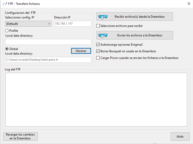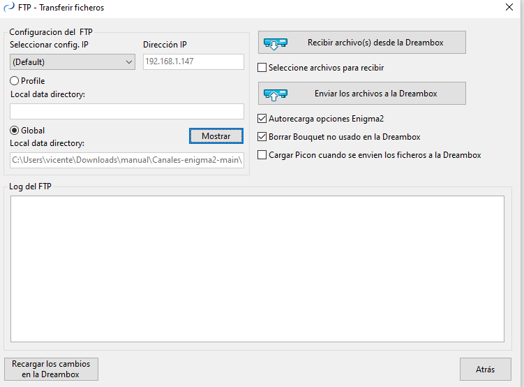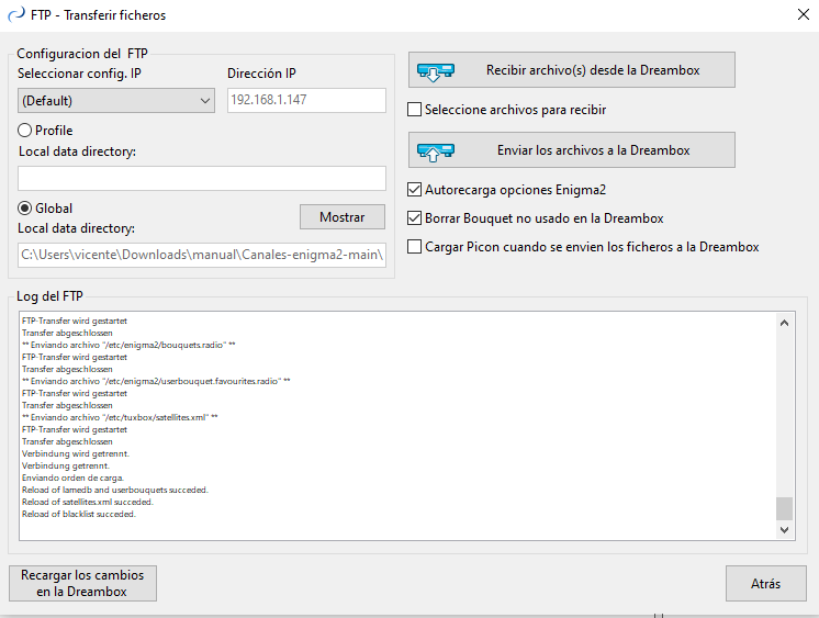 6. Para instalar la lista pulsamos en Enviar los archivos a la Dreambox y observaremos en el log a que termine y ya tendremos la lista actualizada.