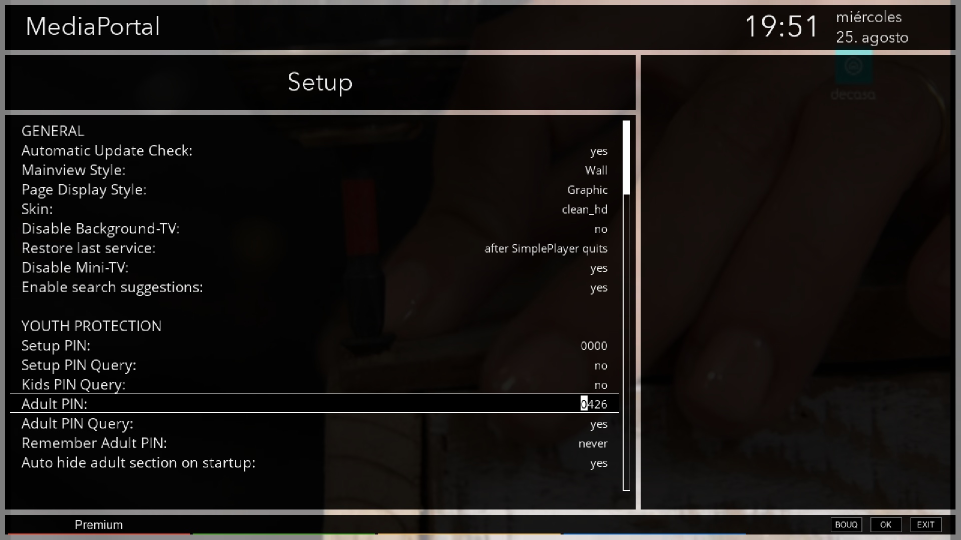 El contenido para adultos esta protegido, para acceder al mismo debemos saber el pin de acceso, para ello en el menu principal pulsamos menu y accederemos a la configuracion de MediaPortal donde observaremos el Adult PIn, que apuntamos.