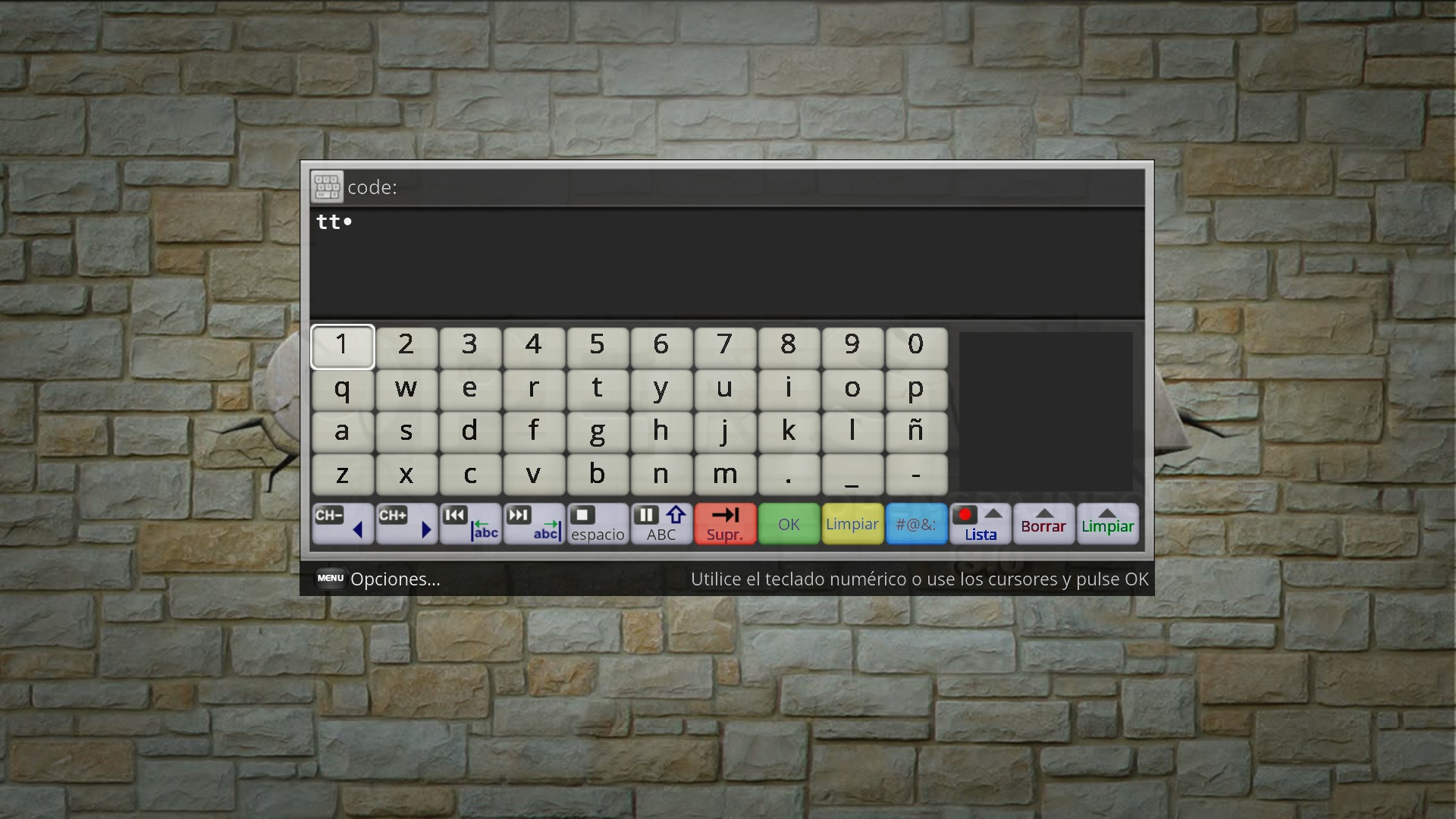 Pulsamos para introducir numeros se nos abrira teclado virtual para introducir caracteres, introducimos el codigo que tengamos, al finalizar pulsamos boton verde (ok)