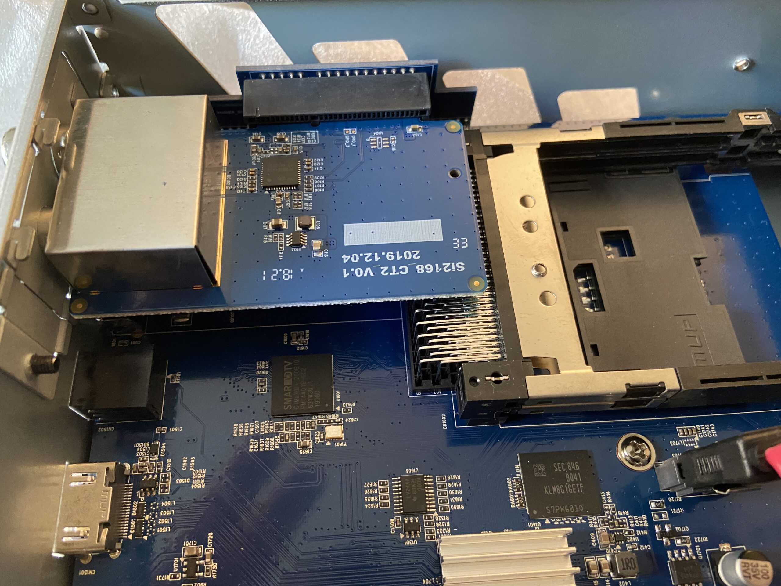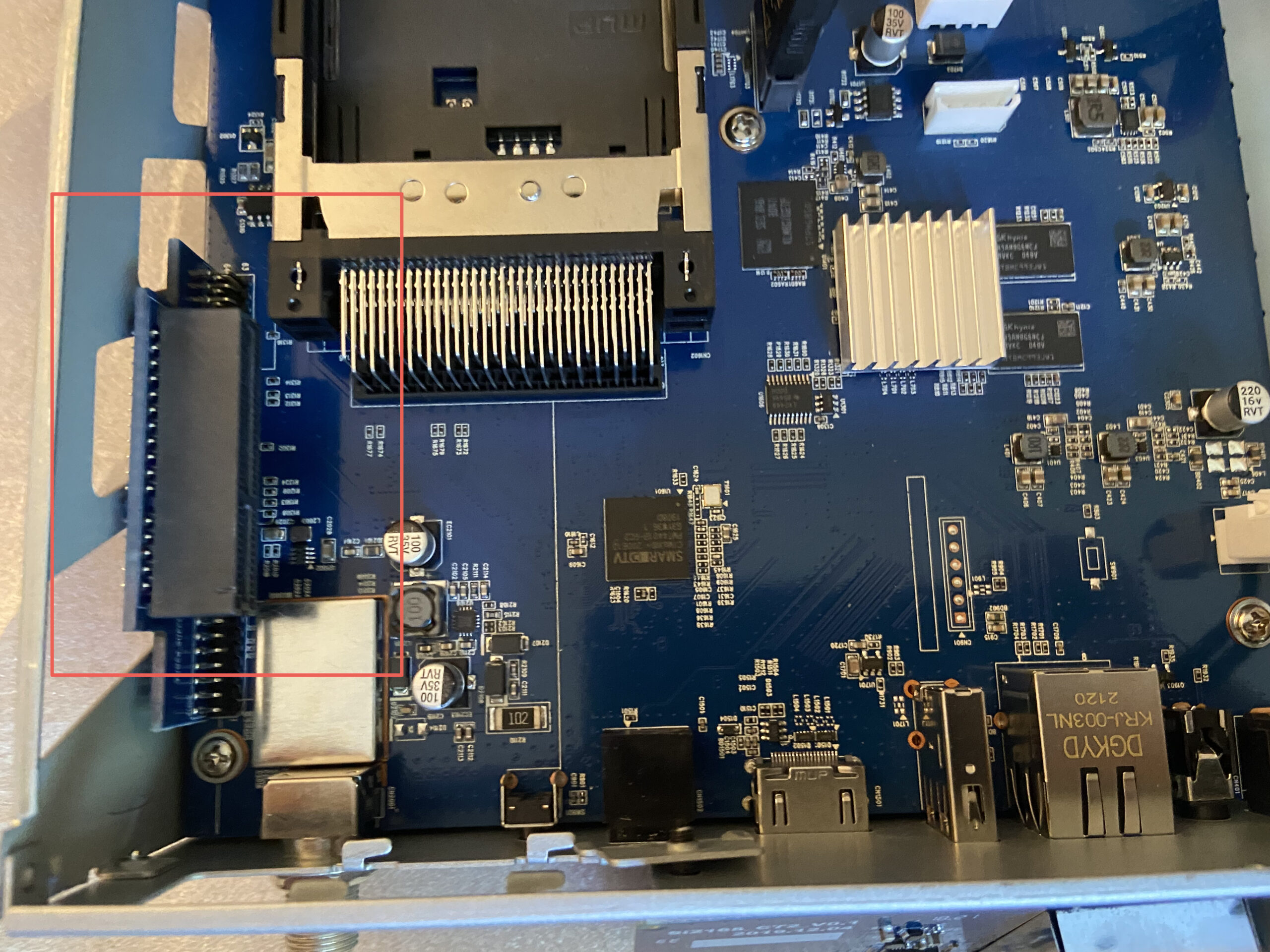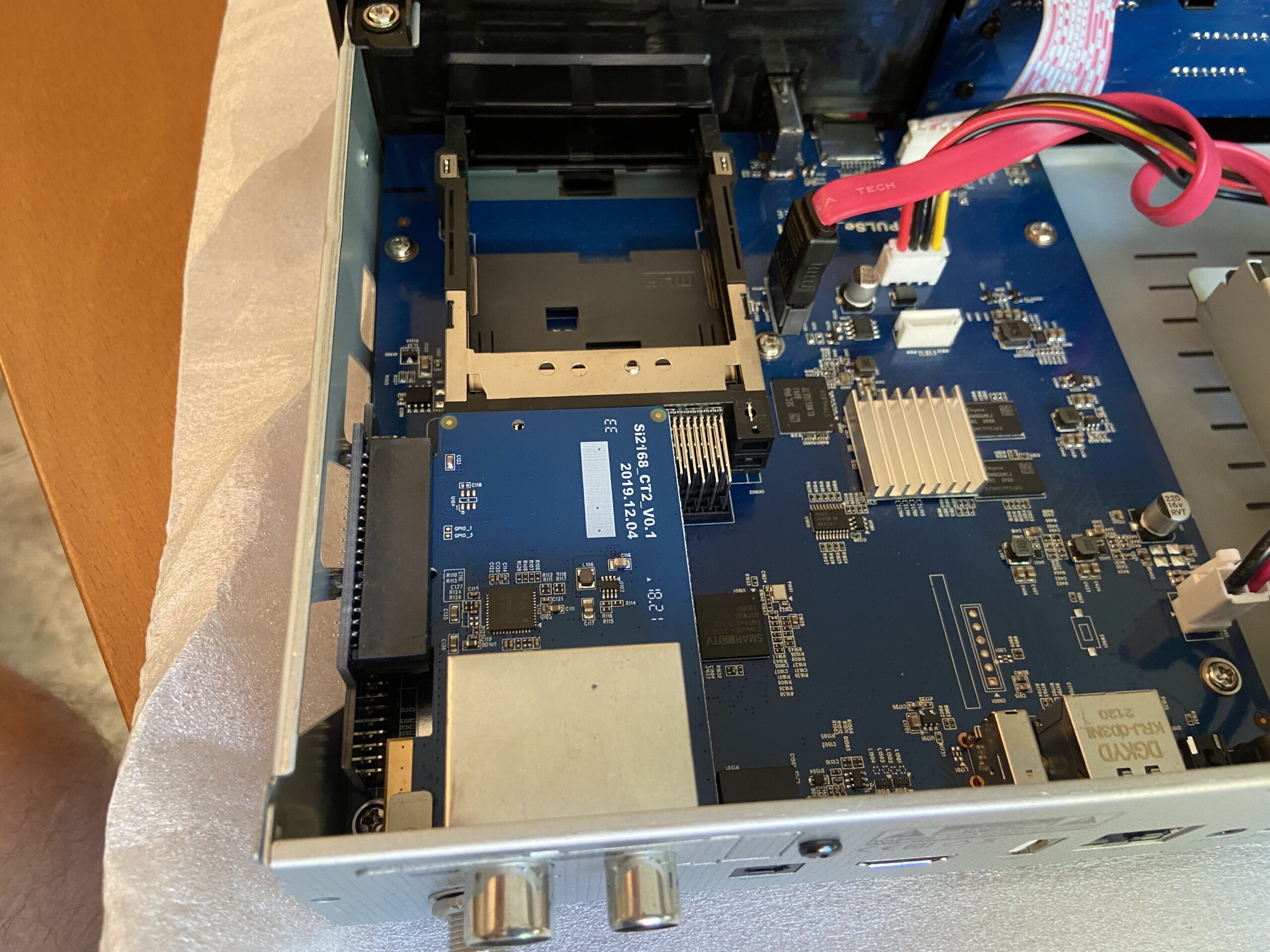 A continuacion el tuner se coloca horizontalmente al conector ubicado en la parte izquierda si lo miramos desde la parte posterior del receptor, que hemos enmarcado en rojo en la siguiente captura