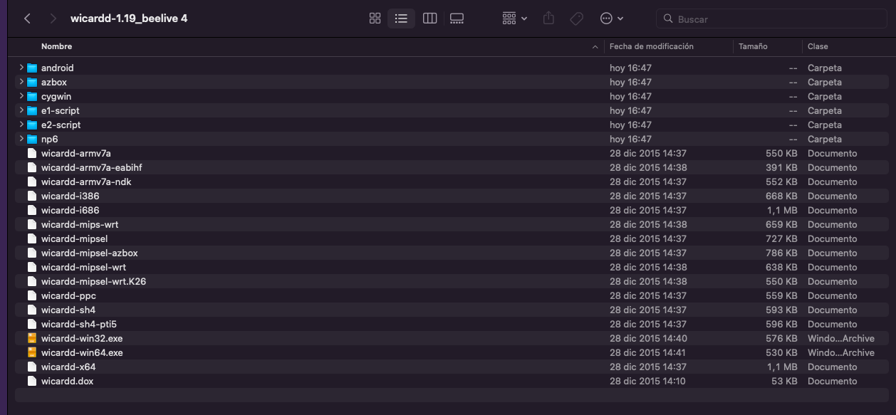 Una vez ya sabemos cual es el tipo de cpu de nuestro receptor, nos descargamos la ultima version de Wicardd oficial y de los archivos que se encuentra comprimidos escogemos el referente a nuestra cpu: