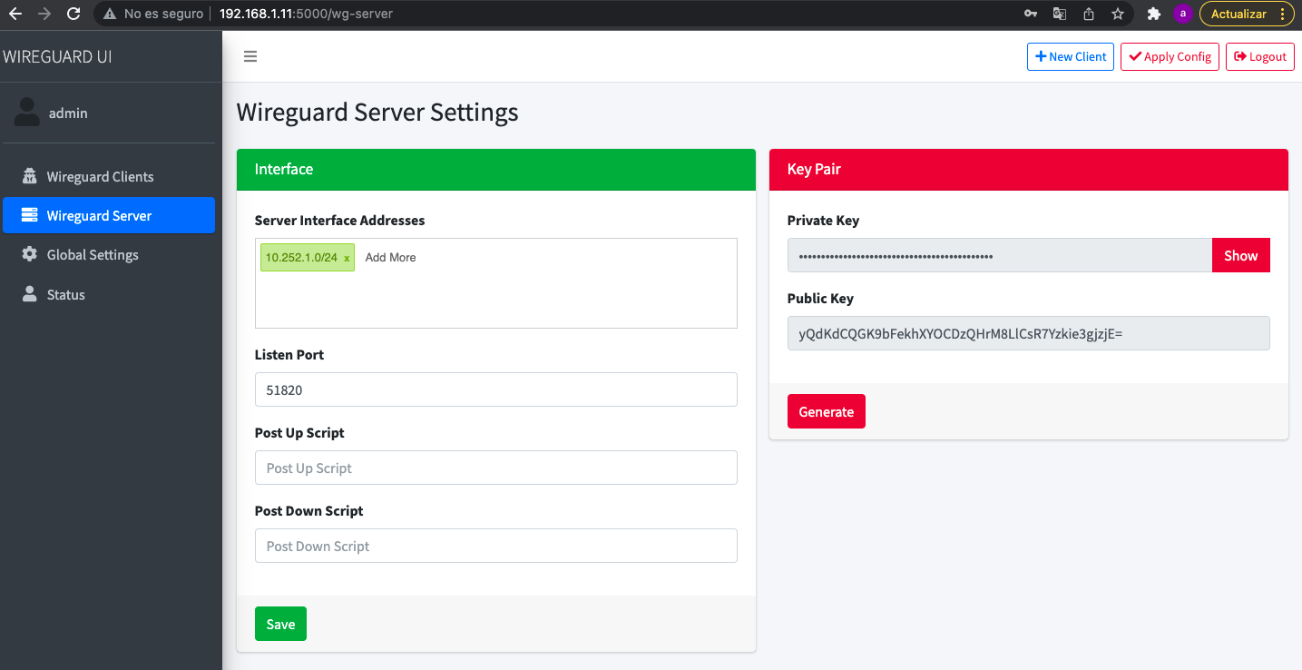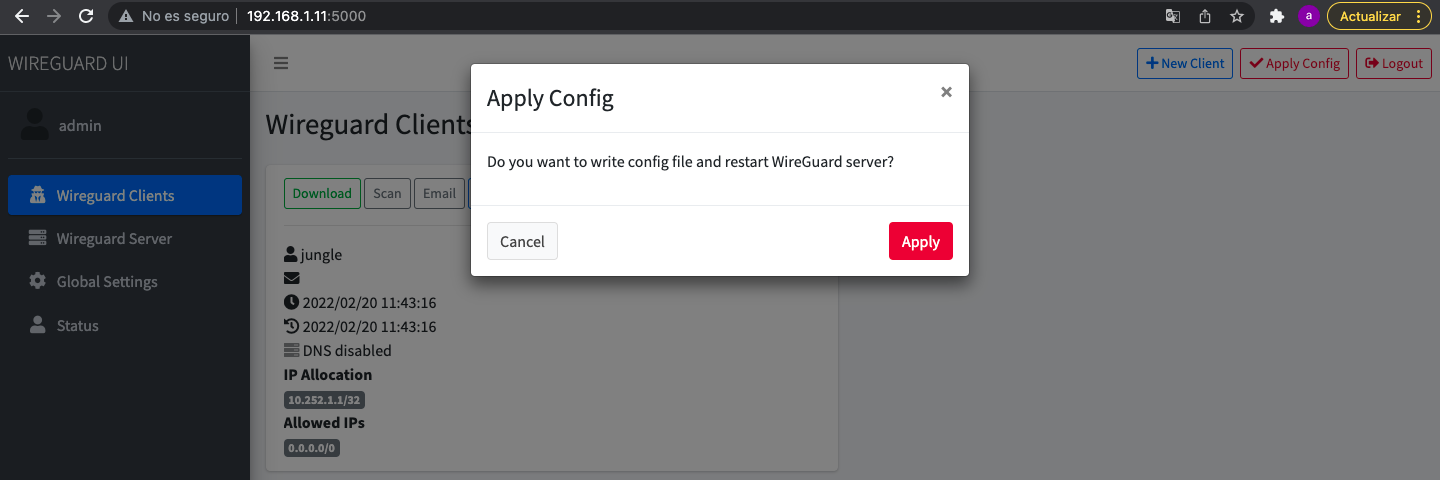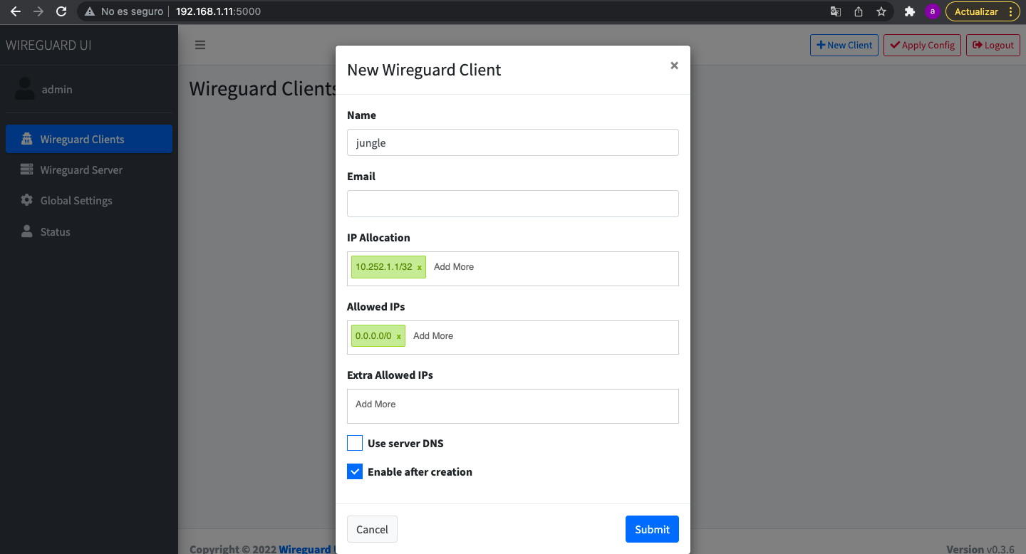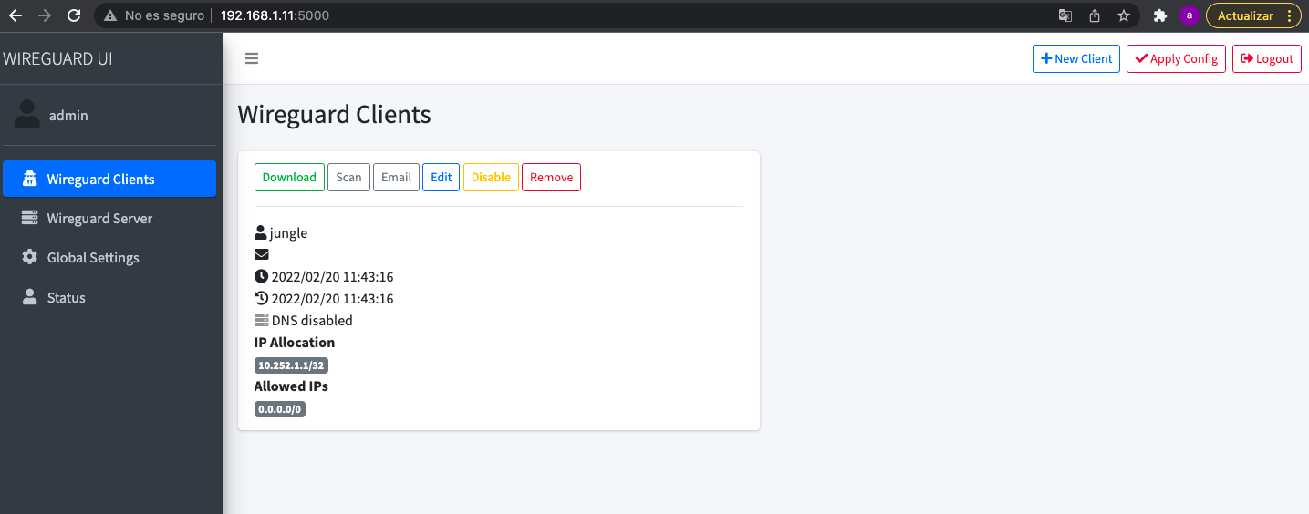 Para terminar añadimos un cliente para ello pulsamos sobre Wireguard Clients
