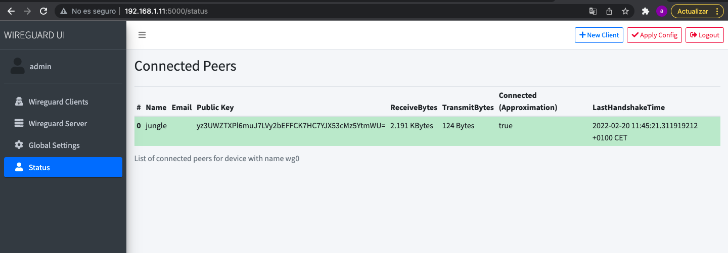observaremos en la interfaz web de wireguard-ui el estado de los clientes