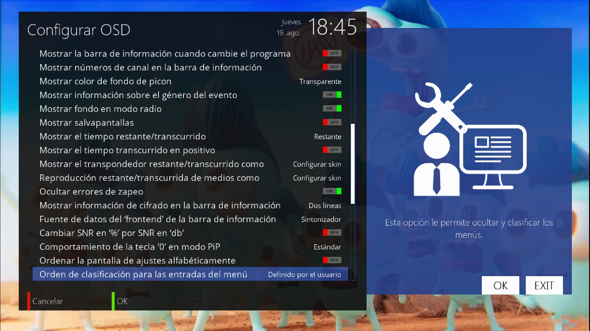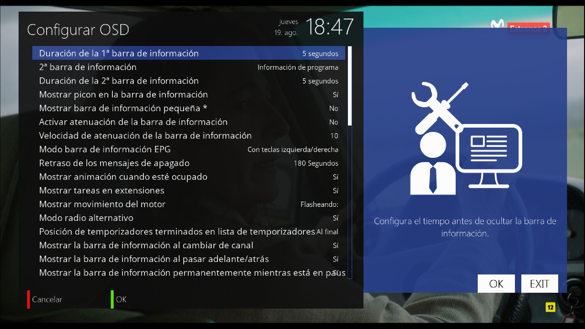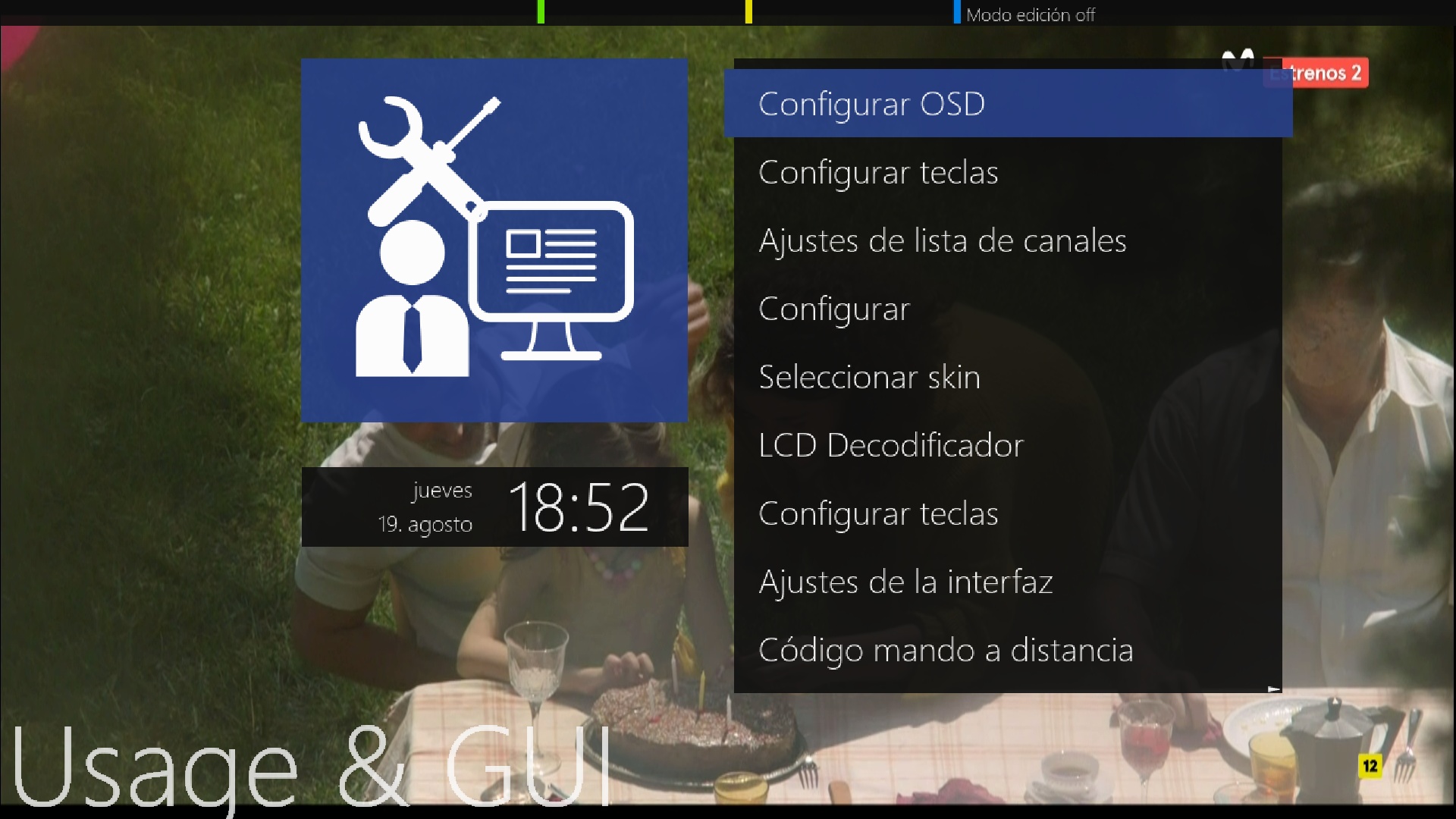 Para seleccionar que modelo de interfaz grafica deseamos usar debemos acceder a menu + configuracion + Usage & GUI + Configurar OSD