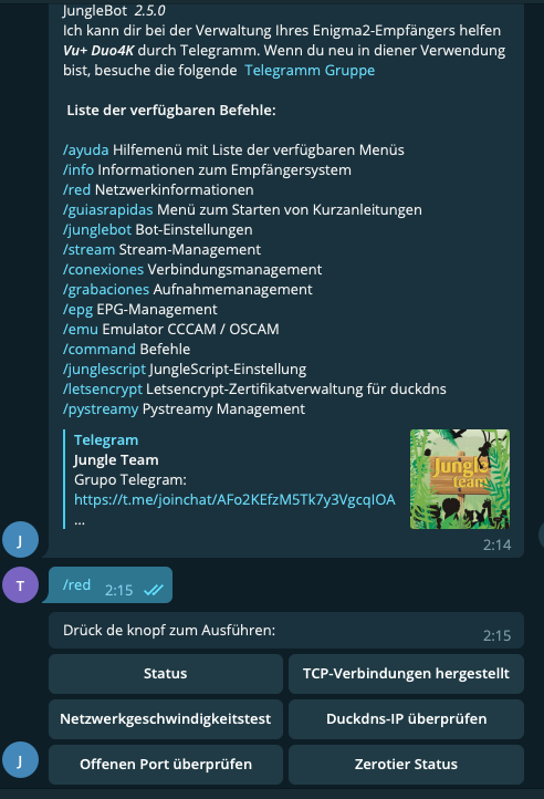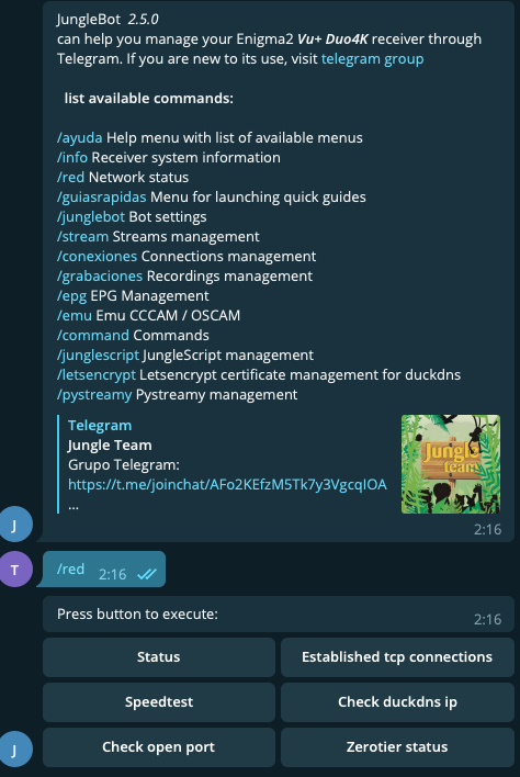 Para el uso del bot telegram que hemos creado, y que nuestro receptor enigma2 le pueda enviar mensajes asi como poder controlar el receptor desde el mismo bot, es necesario realizar la instalacion de JungleBot en nuestro receptor.