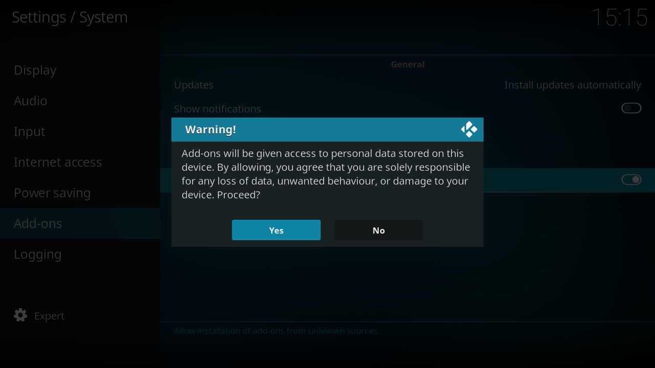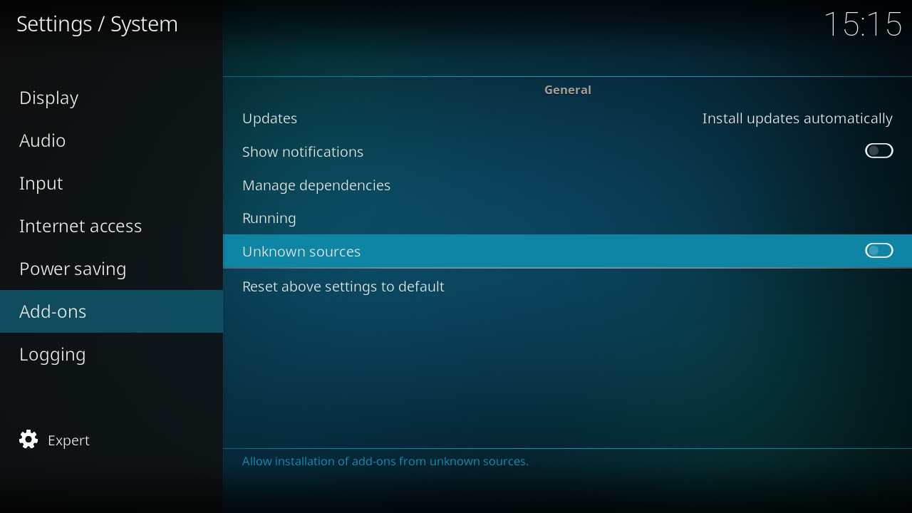 Si hemos realizado la instalacion de kodi por primera vez para poder instalar archivos es necesario activar los permisos para desconocidos , para ello se realiza en configuracion + sistema y activamos unknown