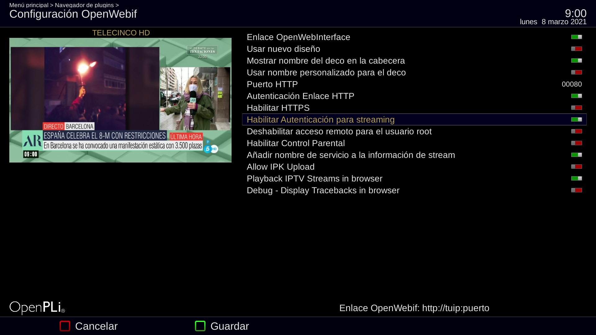 - Configuracion en openwebif habilitando autentificacion http + instalar streamproxy