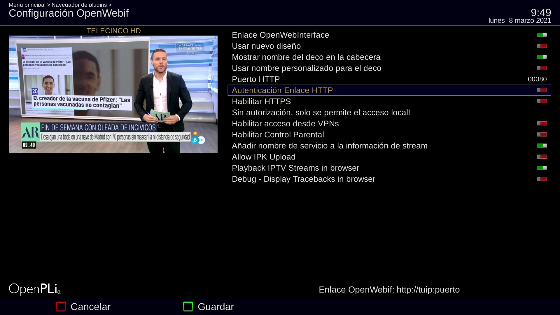Como vimos en realizar stream en red local, hay app y programas que requieren para crear las listas de canales acceder a la api de openwebif, por lo tanto como vamos a tener que redirigir este puerto 80 fuera de en el caso que usemos este tipo de programas o app vamos a activar la autentificacion del puerto web, para ello en configuracion de openwebif activamos la autentificacion enlace http