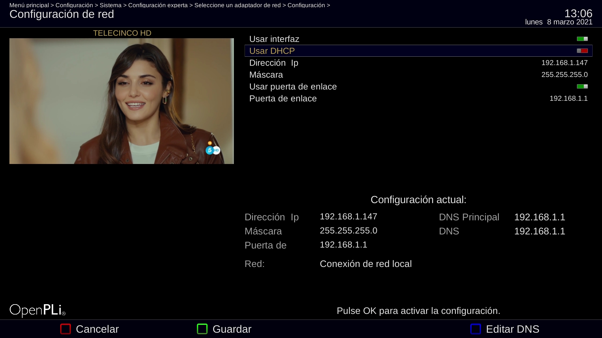 En el supuesto que nuestro router no tenga esa opcion, podemos realizarlo de una manera algo menos eficaz pero que tambien cumple su funcion que es a traves de menu de configuracion red del receptor donde marcaremos la opcion dhcp en no e introduciremos la ip que deseamos que tenga el receptor