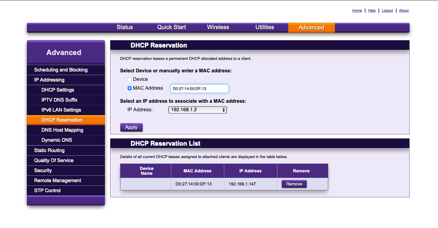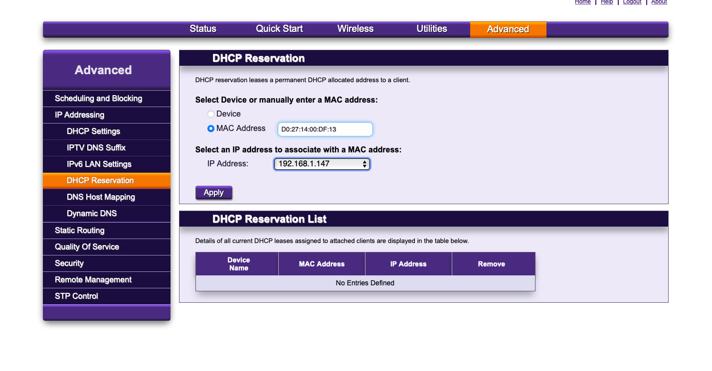 Ahora en vuestro router en la opcion de reserva dhcp (cambiara dependiendo de vuestro router) añadimos esa mac e introducimos una ip de red que deseemos que tenga el receptor y con esto nos aseguramos que el receptor siempre va a tener esa ip