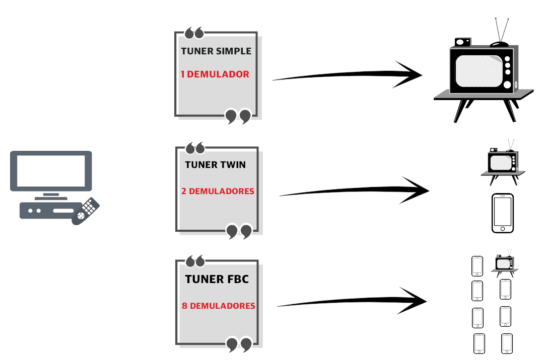 Los receptores con tuner FBC permiten usar un demulador para el receptor para ver los canales tv, y ademas tener 7 demuladores libres que nos permitira transmitir los canales de 7 frecuencias distintas, es decir podremos tener hasta 7 dispositivos totalmente independientes conectados a nuestro receptor.