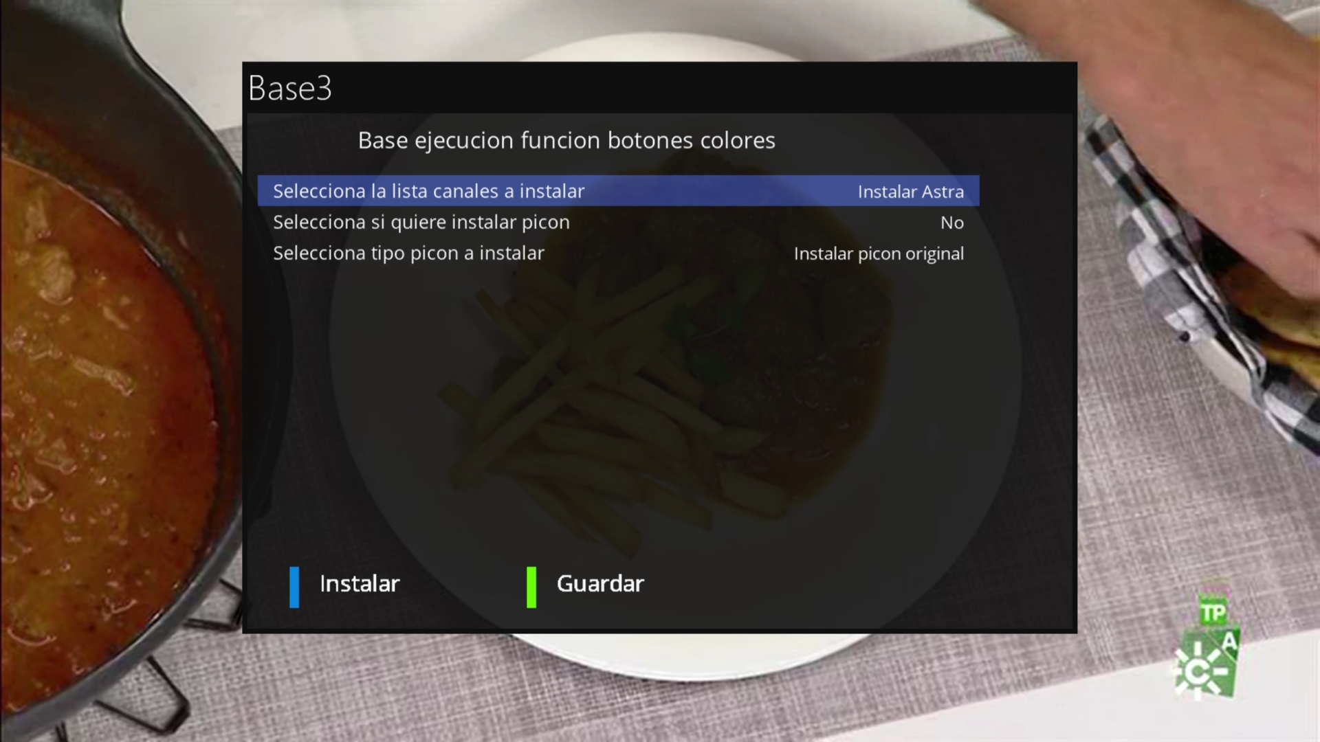 4. Ahora vemos las funciones de ejecucion que se le han añadido a los dos botones, en cuanto al boton green le hemos añadido la misma funcion que el boton ok que ya se explica en la leccion 2, o sea funcion de save, y al boton azul se le ha añadido la funcion de instalar la lista de canales ejecutando el script de junglescript:
