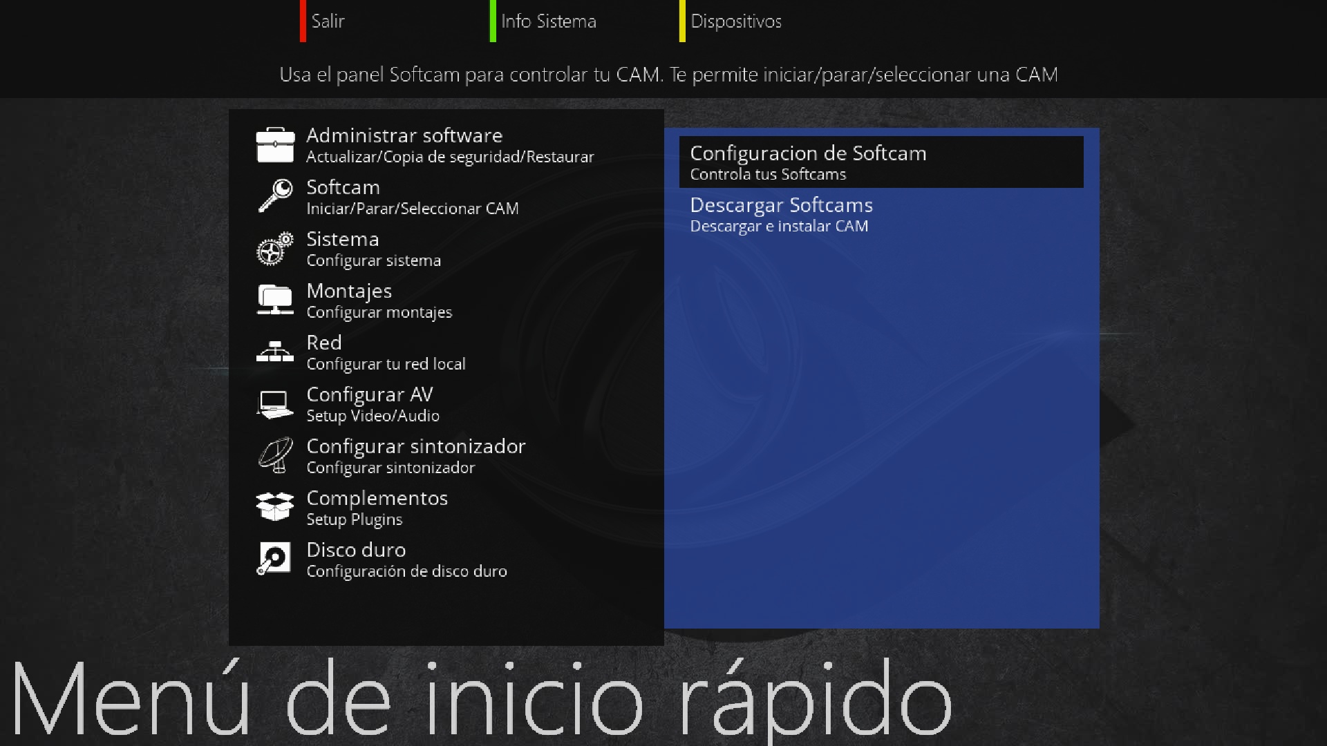 Pulsamos en menu + complementos + boton verde y seleccionamos softcams