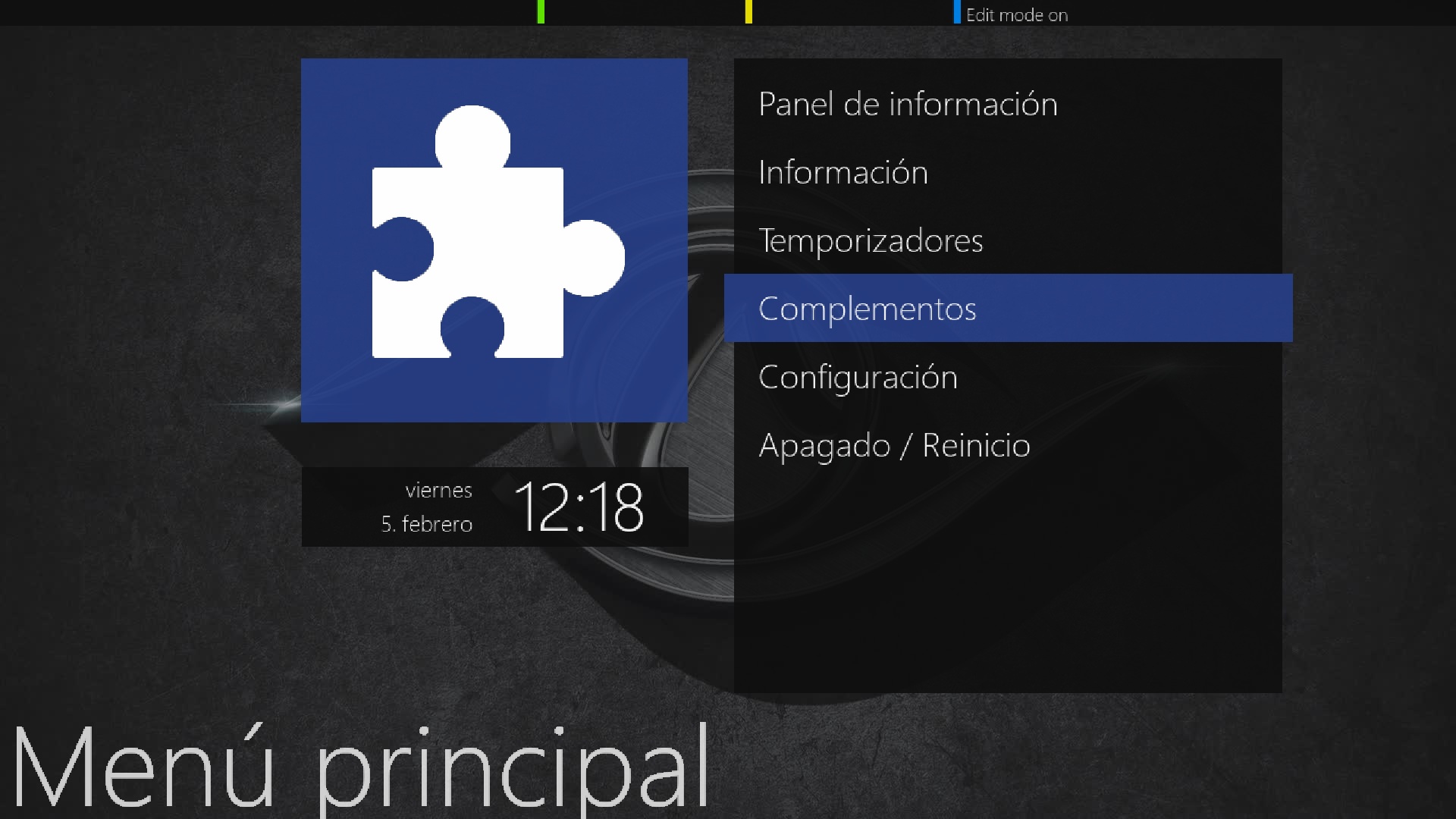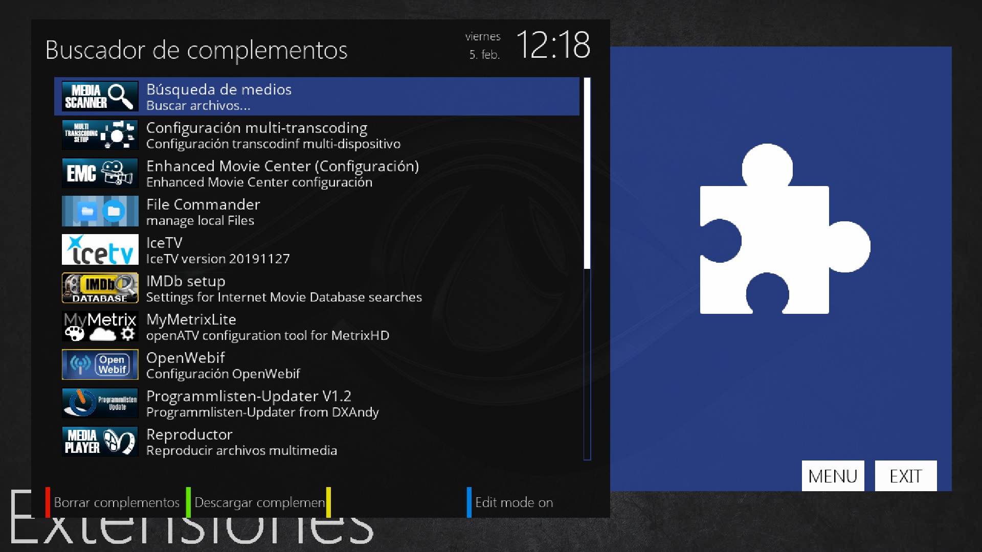 Ahora vamos a instalar lista canales, para ello pulsamos en menu + complementos