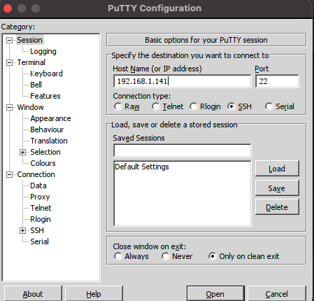 Abrimos el programa putty e introducimos la ip de nuestro receptor y pulsamos en open