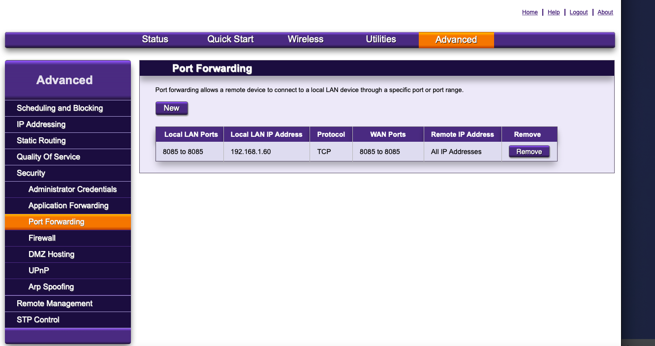Como hemos visto el puerto por el cual realiza el stream es el puerto 8085, pues ahora simplemente deberemos redirigir en nuestro router el puerto 8085 a la ip de nuestro receptor, cada router o compañia lo haremos de maneras diferentes, simplemente comentar que basta el protocolo TCP.