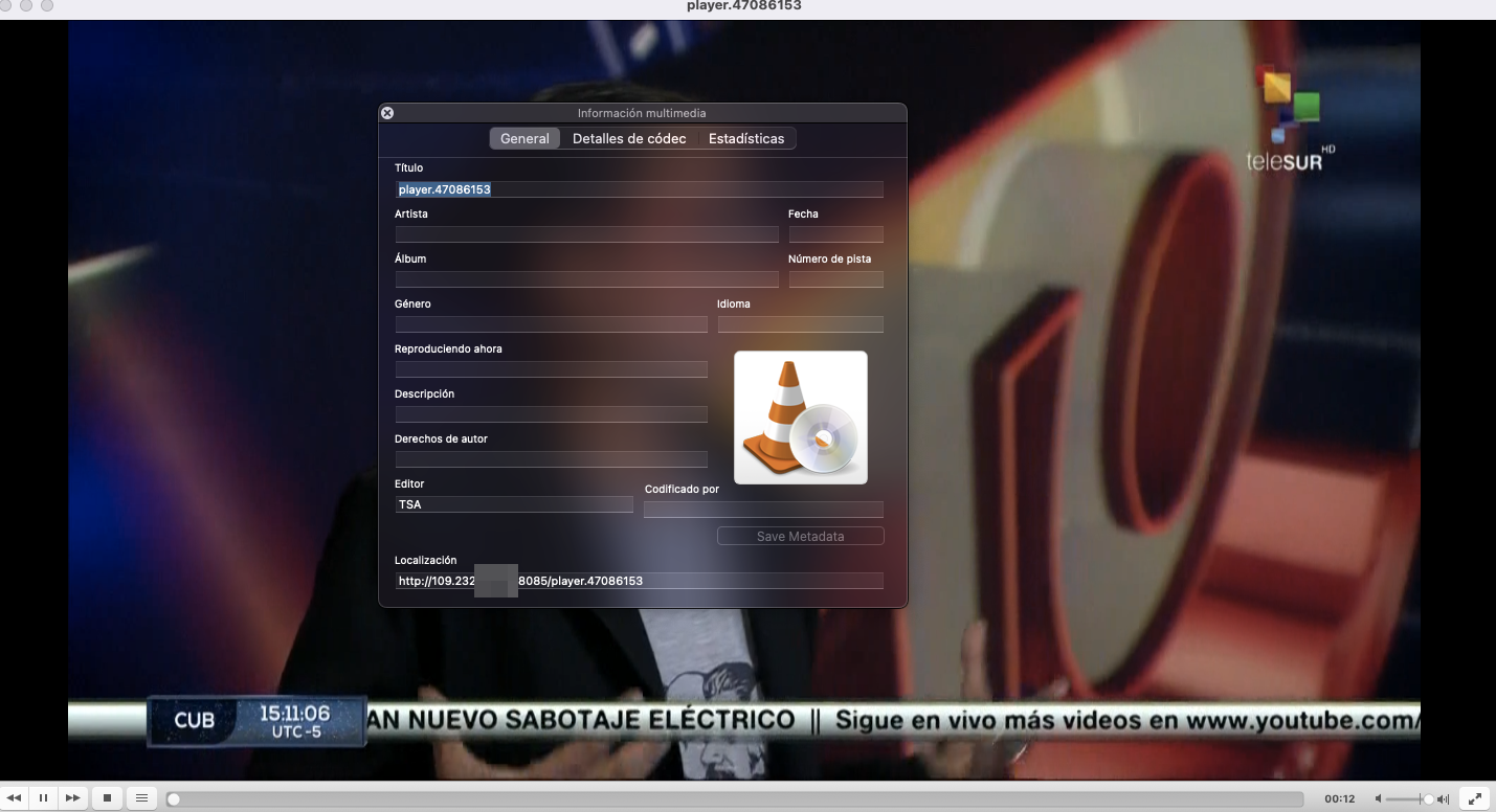 5. Ahora al reproducir el canal a traves de vlc nos aparecera el ID del canal en este caso del canal libre Telesur que seria player.47086153