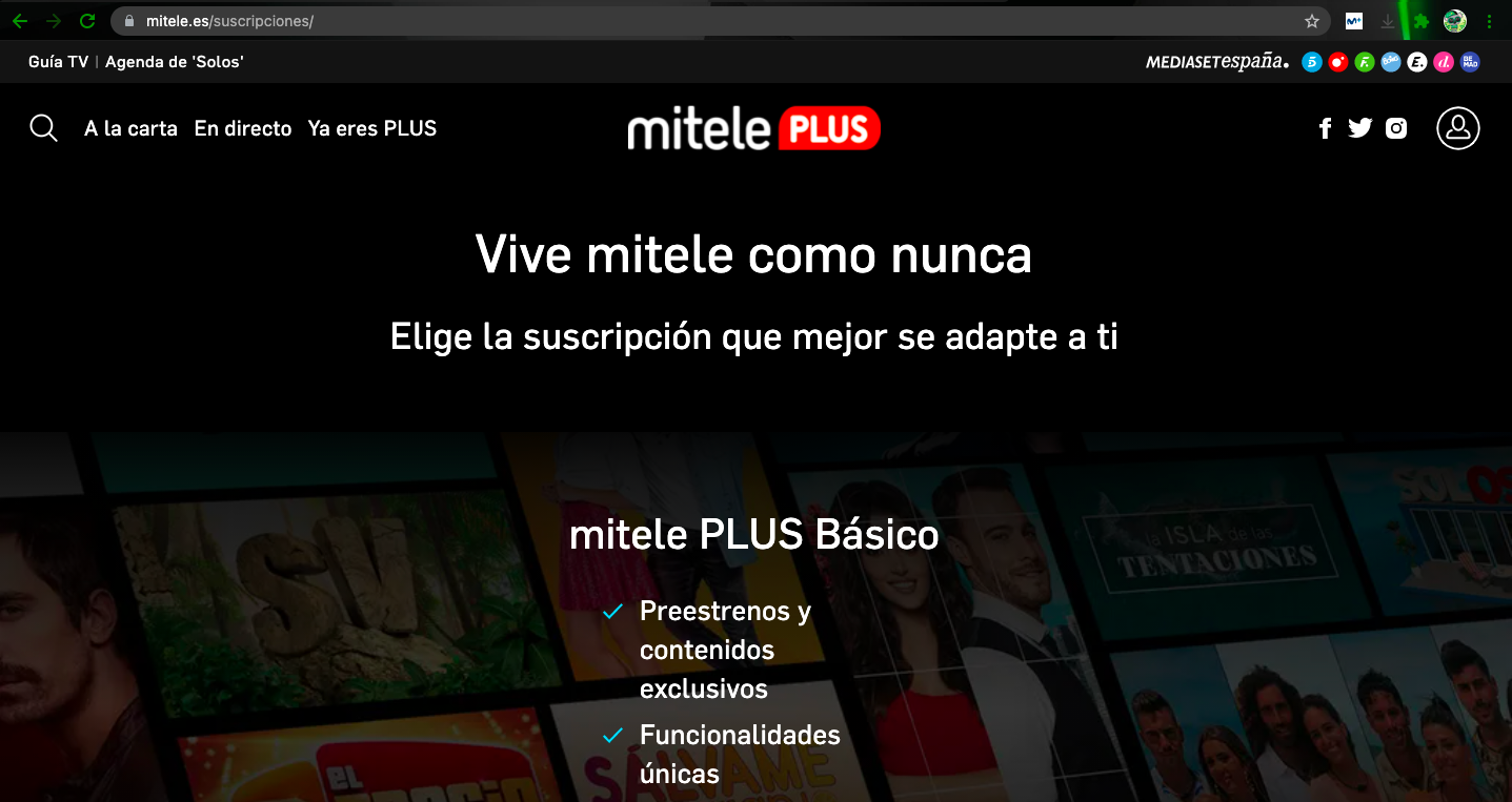 Mitele Plus es la plataforma de televisión a la carta y en directo del grupo Mediaset España que nacio en el año 2019, introduciendose asi en television de pago, como extra a Mitele que es gratuito, siendo por lo tanto una plataforma de suscripción para disfrutar sin interrupciones de toda la oferta de la actual Mitele asi como de contenidos exclusivos y ventajas sobre la version Mitele gratuita.