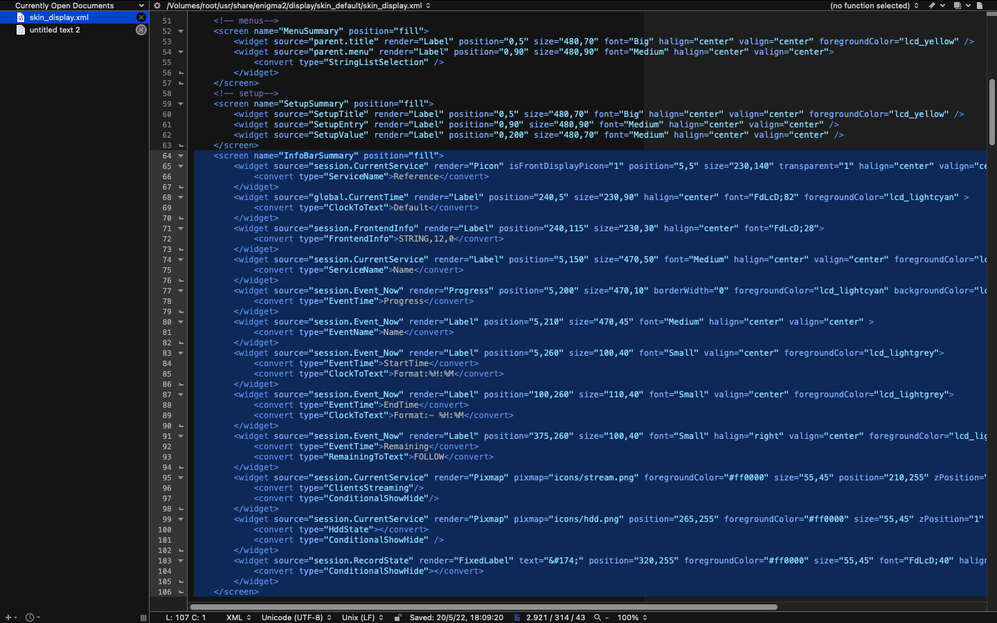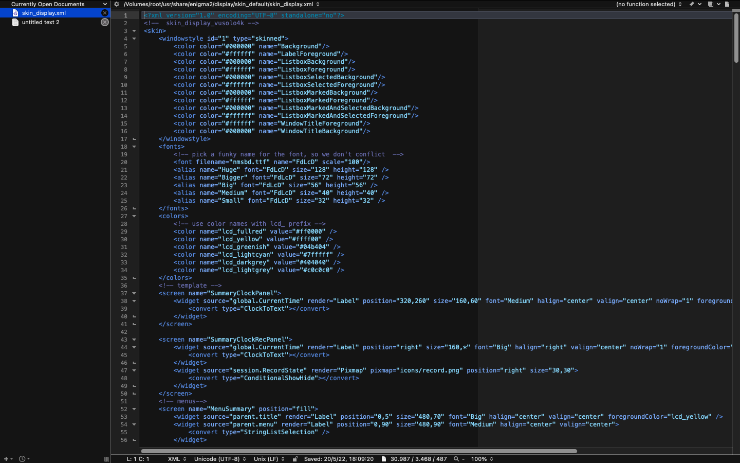 El skin xml para la pantalla LCD en imagen openpli esta situado en el directorio /usr/share/enigma2/display/skin_default modificable en el archivo skin_display.xml