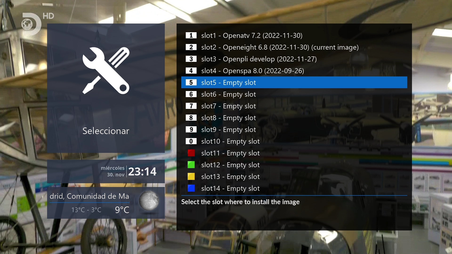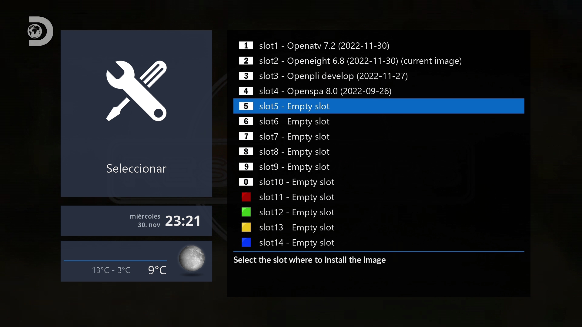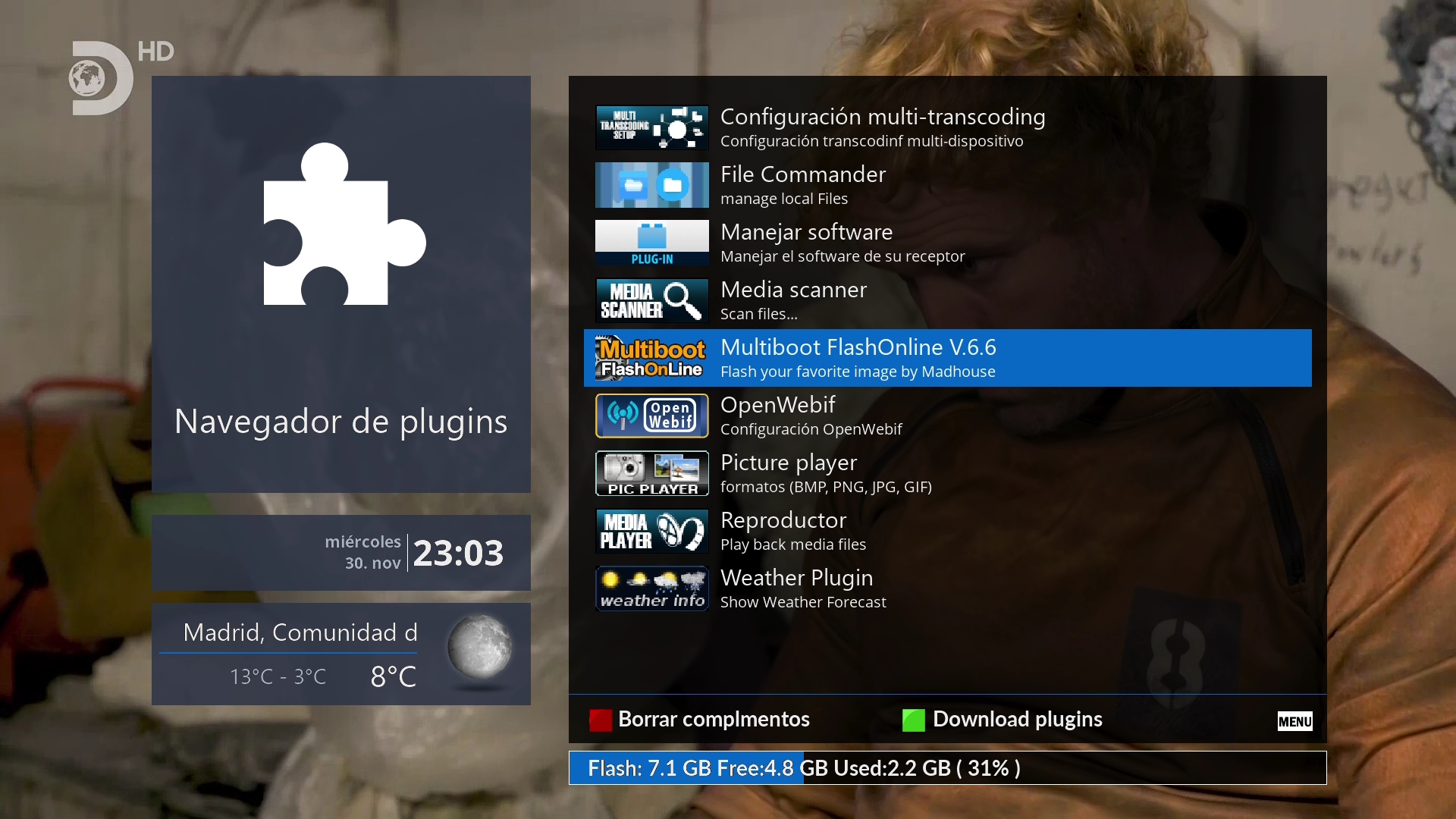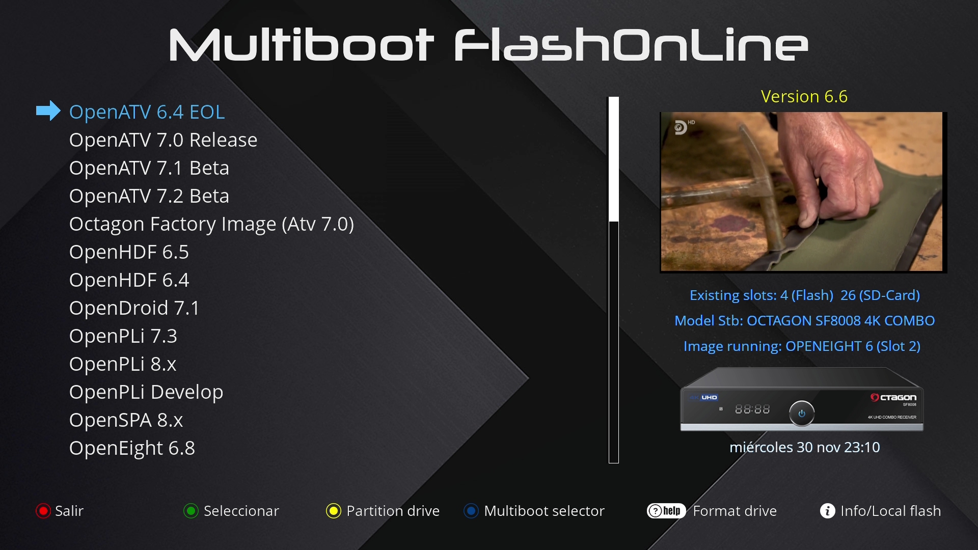 Por otro lado, otra de las maravillas de Multiboot FlashOnline es su sencillez. Tan solo tienes que instalar el plugin en nuestro receptor, y te permita tener un menú gráfico desde el cual gestionar la instalacion de imagenes en multiboot, asi como desde el mismo complemento nos permite descargar una gran variedad de imagenes via ota.