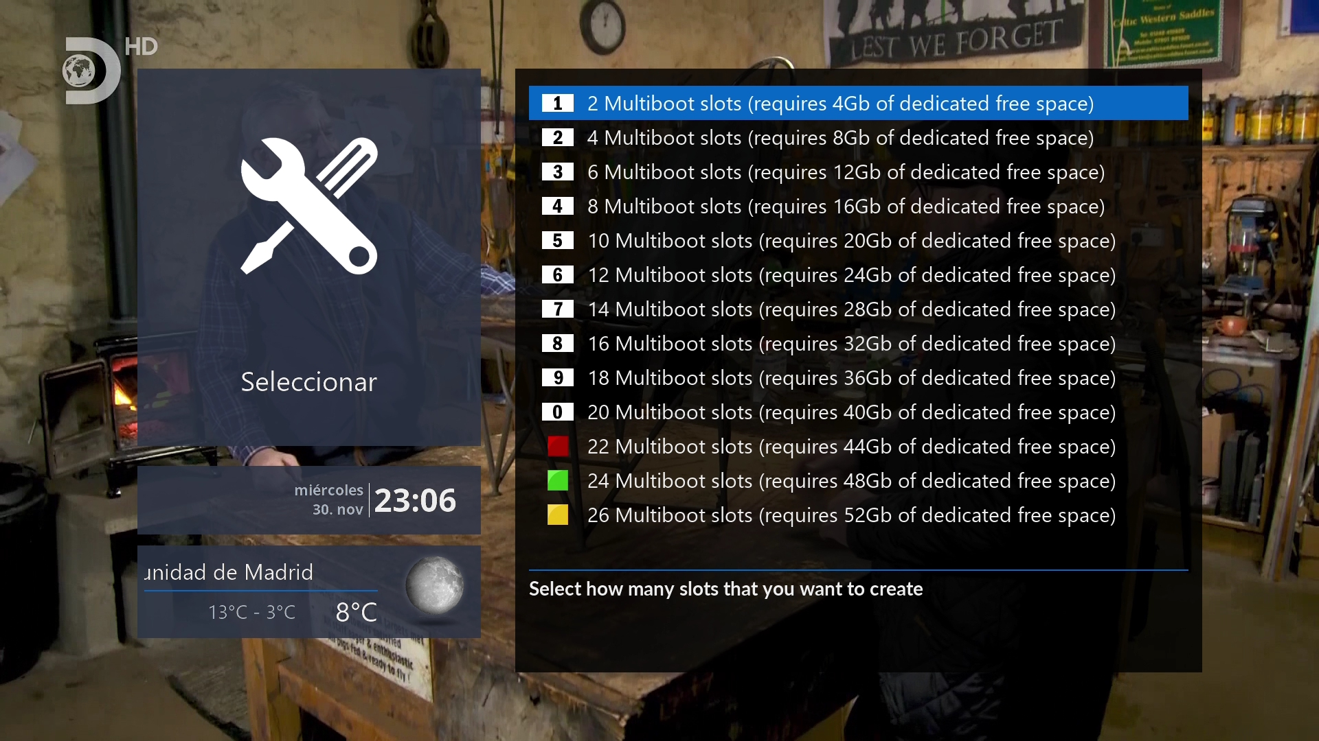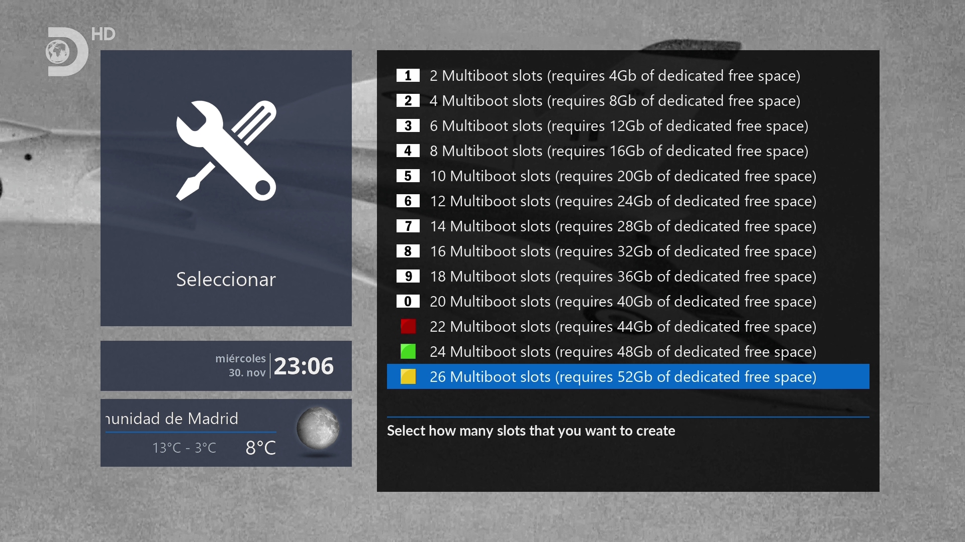 - Receptores que esta disponible el nuevo recovery como por ejemplo octagon sf8008 o Gigablue trio 4k podemos crear minimo 2 particiones maximo 26 particiones, si desea saber como actualizar el recovery por ejemplo en octagon pues seguir este manual: