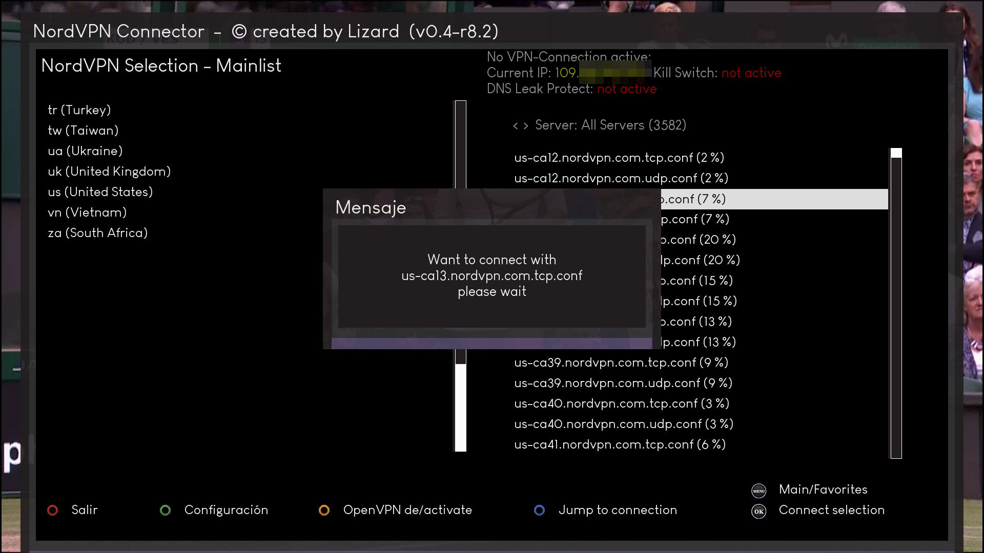 Tras seleccionar el pais pulsamos flecha derecha del mando a distancia para cambiar a la lista de servidores correspondientes a ese pais y seleccionamos el servidor al que deseamos conectarnos