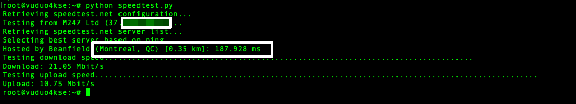 Una vez hemos realizado la conexion al servidor vpn a traves del plugin NordVPN, vamos a realizar un test de conexion para ver desde que pais salimos conectados y la velocidad de descarga y subida en este caso usando la utilidad python speedtest que tras ejecutarlo observamos: