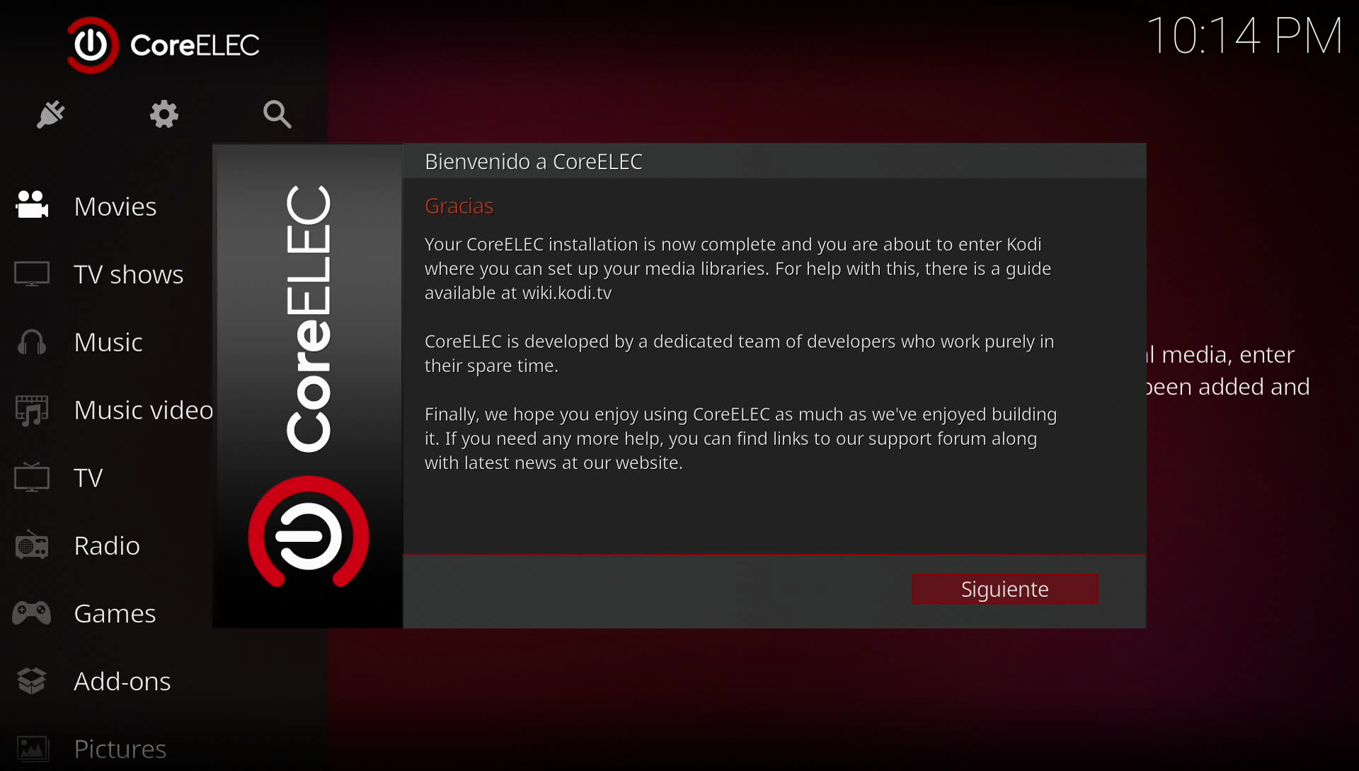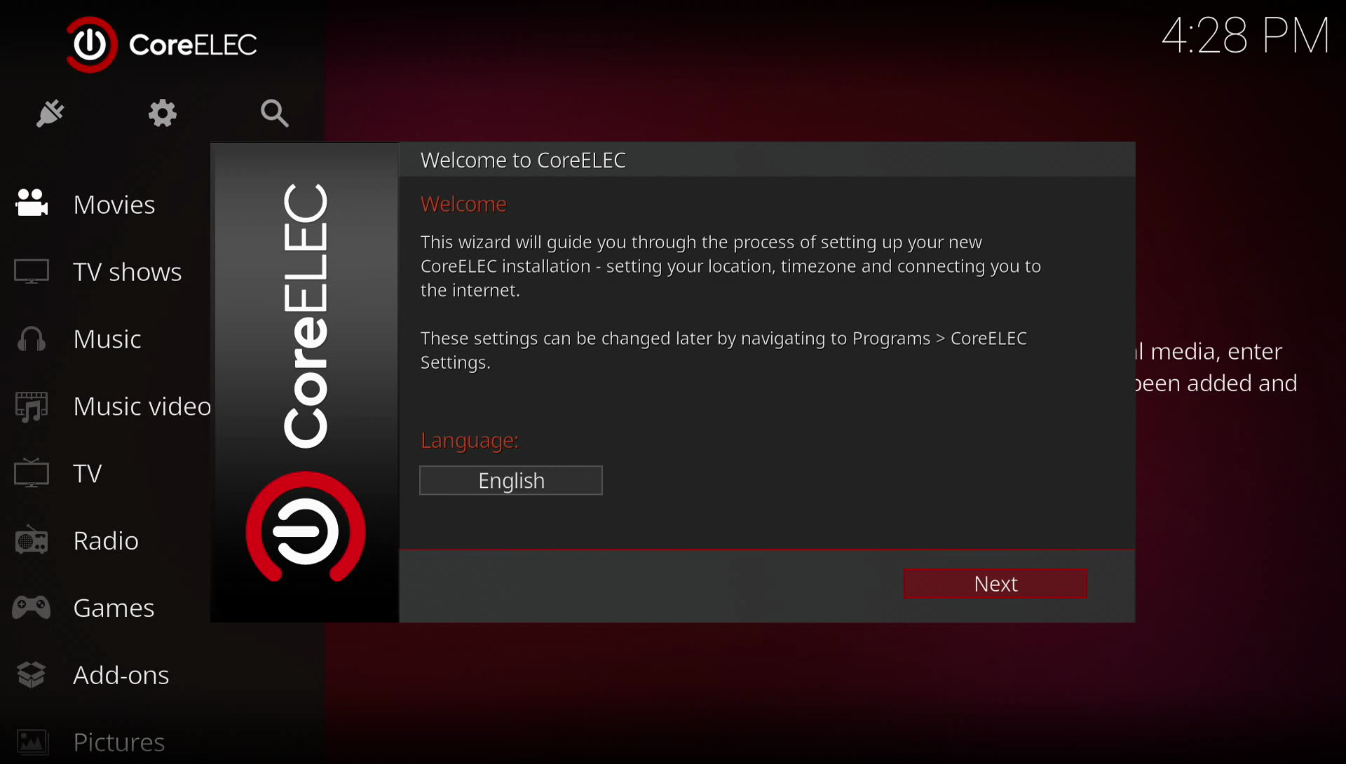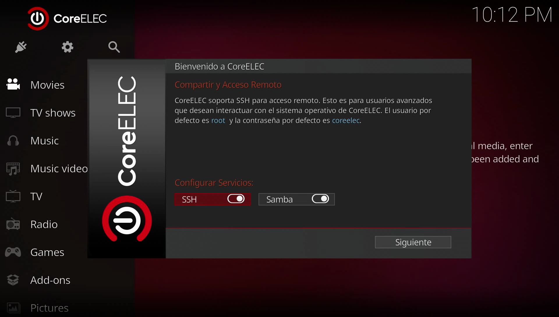Una vez instalado Coreelec por primera vez nos aparecerá el wizard de primera configuración en nuestra Odroid N2, la cual nos guiara en una primera configuración básica.
