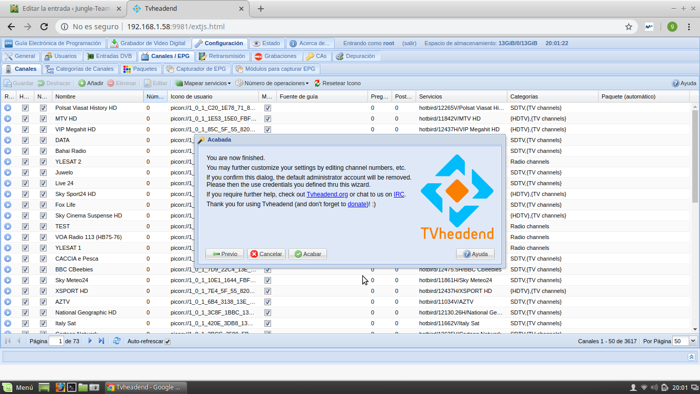 Tras la instalacion completa si accedemos al webif de tvheandend observaremos que el epg-koala se activa por defecto: